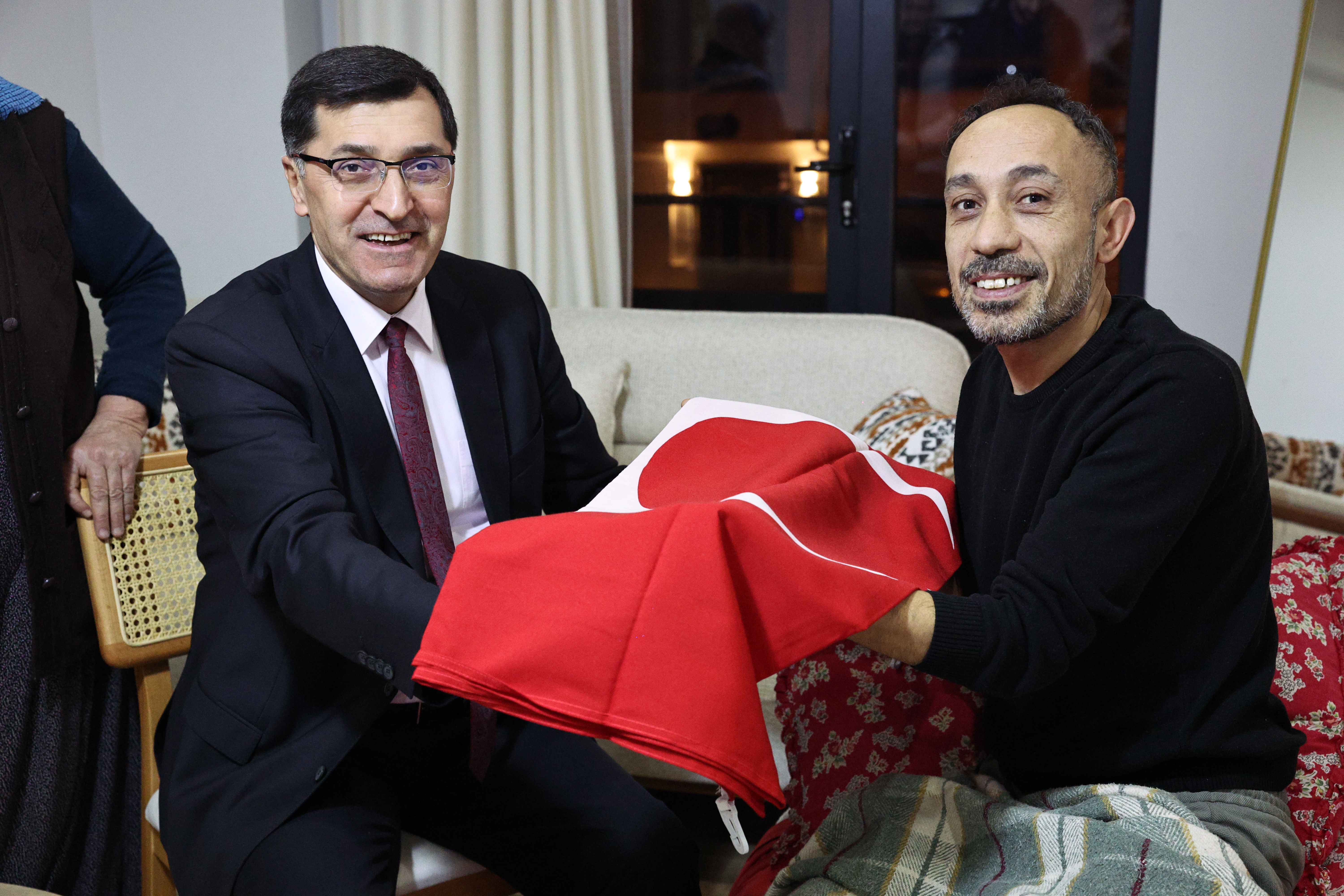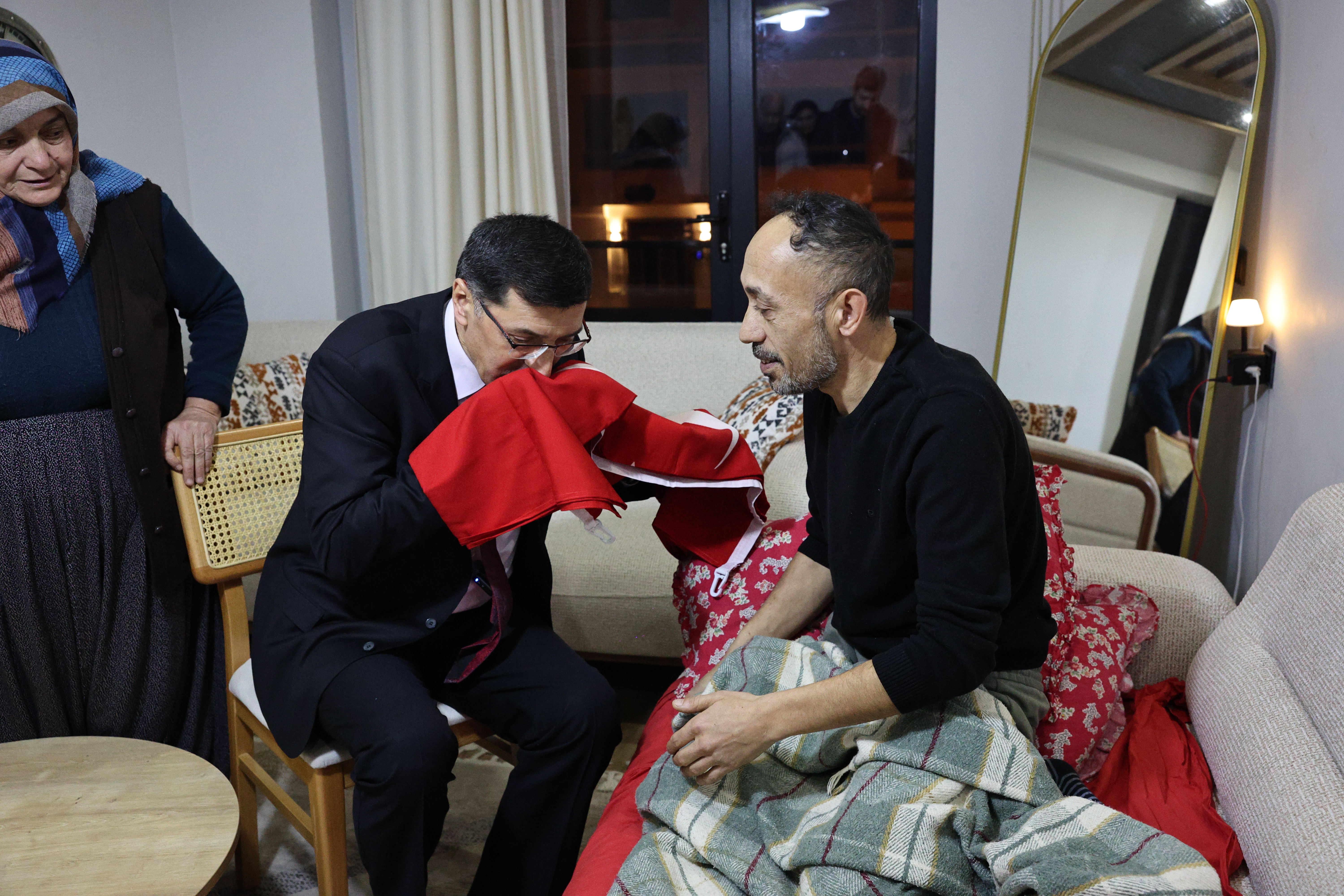 Kütahya Belediye Başkanımız Eyüp Kahveci, geçtiğimiz günlerde ameliyat geçiren ve başarılı bir operasyonla vücudundaki kurşunlar çıkarılan Gazi Piyade Topçu Er Mehmet Tüfek’i evinde ziyaret ederek, gazimizin talep ettiği Türk Bayrağı’nı teslim etti.