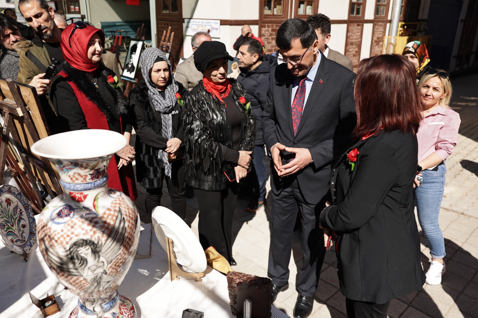 Kadın sanatçılarımız ve üreticilerimiz tarafından hazırlanan sergide tablolar, süs eşyaları ve el sanatları gibi birçok eser ziyaretçilerin beğenisine sunuldu. Sergiyi gezerek kadın sanatçılarla sohbet eden Belediye Başkanımız Eyüp Kahveci, kadın emeğinin sanatla buluşmasının büyük bir değer taşıdığını belirterek, “Bugün, sadece kadınların başarılarını ve emeklerini kutladığımız bir gün değil, aynı zamanda onların her alanda daha güçlü ve görünür olması gerektiğini bir kez daha hatırlama günü. Kadınlarımızın sanata kattığı değer, hayatımıza zarafet ve anlam katıyor” dedi.