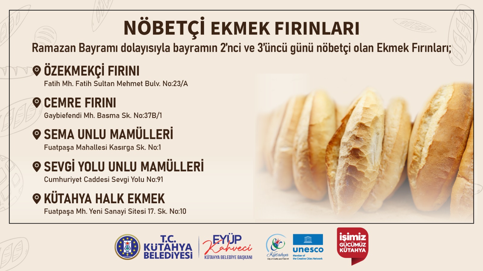 Hemşehrilerimizin bayramda mağduriyet yaşamaması adına gerekli düzenlemeler yapıldı. Nöbetçi fırınlarımız, bayramın ikinci ve üçüncü gününde de ekmek temin edebilmeniz için hizmetinizde olacaktır.