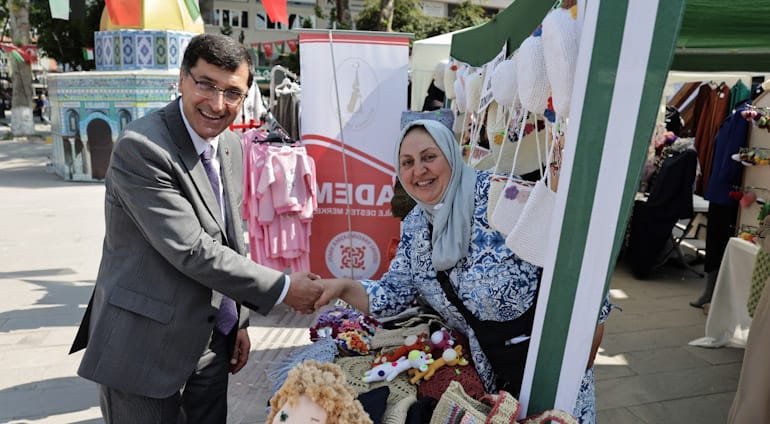 Kütahya Belediye Başkanımız Eyüp Kahveci, Aile Destek Merkezleri (ADEM) Projesi kapsamında eğitim alan kadınlar tarafından hazırlanan el emeği göz nuru ürünlerin yer aldığı sergiyi ziyaret etti.Kütahya Valiliği koordinasyonunda, Aile ve Sosyal Hizmetler İl Müdürlüğü ile Halk Eğitim Merkezi iş birliğiyle hayata geçirilen proje kadınlarımızın hem meslek öğrenmesine hem de sosyal hayata aktif katılmasına olanak sağladı. Kadınlarımızın alın teri ve el emeğiyle hazırlanan ürünler, düzenlenen sergide sanatsever vatandaşlarımızla buluştu.
