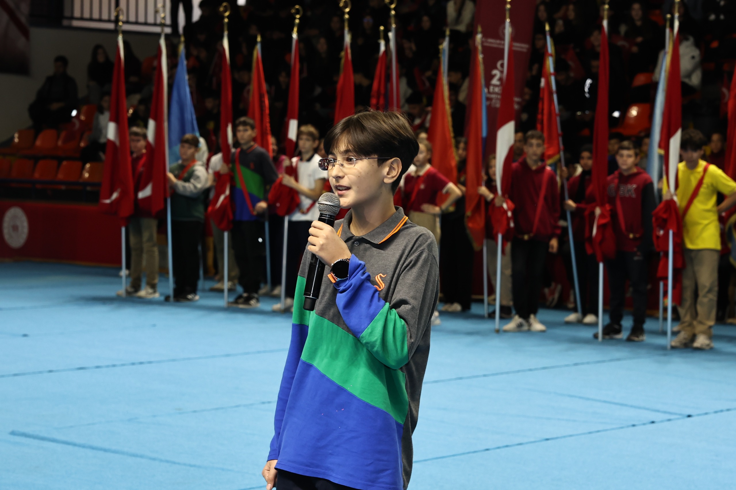 Saygı duruşu ve İstiklal Marşı’nın okunmasıyla başlayan törende, Vali Işın’ın günün anlam ve önemine ilişkin konuşmasının ardından öğrenciler tarafından şiirler okundu. Halk oyunları gösterisiyle renklenen tören, dereceye giren sporculara ödüllerinin verilmesi ve Tugay Bandosu’nun müzik dinletisiyle devam etti.