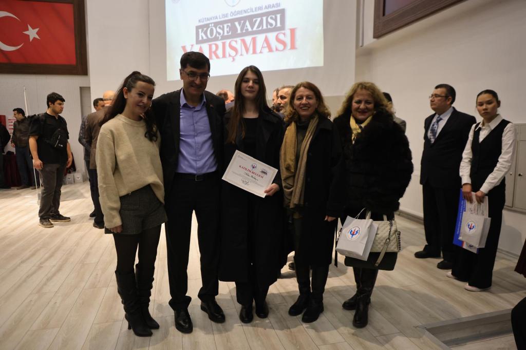 Kütahya Belediye Başkanımız Eyüp Kahveci, 10 Ocak Çalışan Gazeteciler Günü kapsamında Kütahya Gazeteciler Birliği tarafından düzenlenen Kütahya Lise Öğrencileri Arası Köşe Yazısı Yarışması Ödül Töreni'ne katılarak genç kalemlerin heyecanına ortak oldu.Kütahya Milli Eğitim Müdürlüğü Konferans Salonu’nda gerçekleştirilen törende, düşüncelerini yazıyla ifade etme cesareti gösteren lise öğrencileri ödüllerini il protokolünden alırken; Belediye Başkanımız Eyüp Kahveci, gençlerimizin yazı yazmaya olan ilgisinin umut verici olduğunu ifade etti.