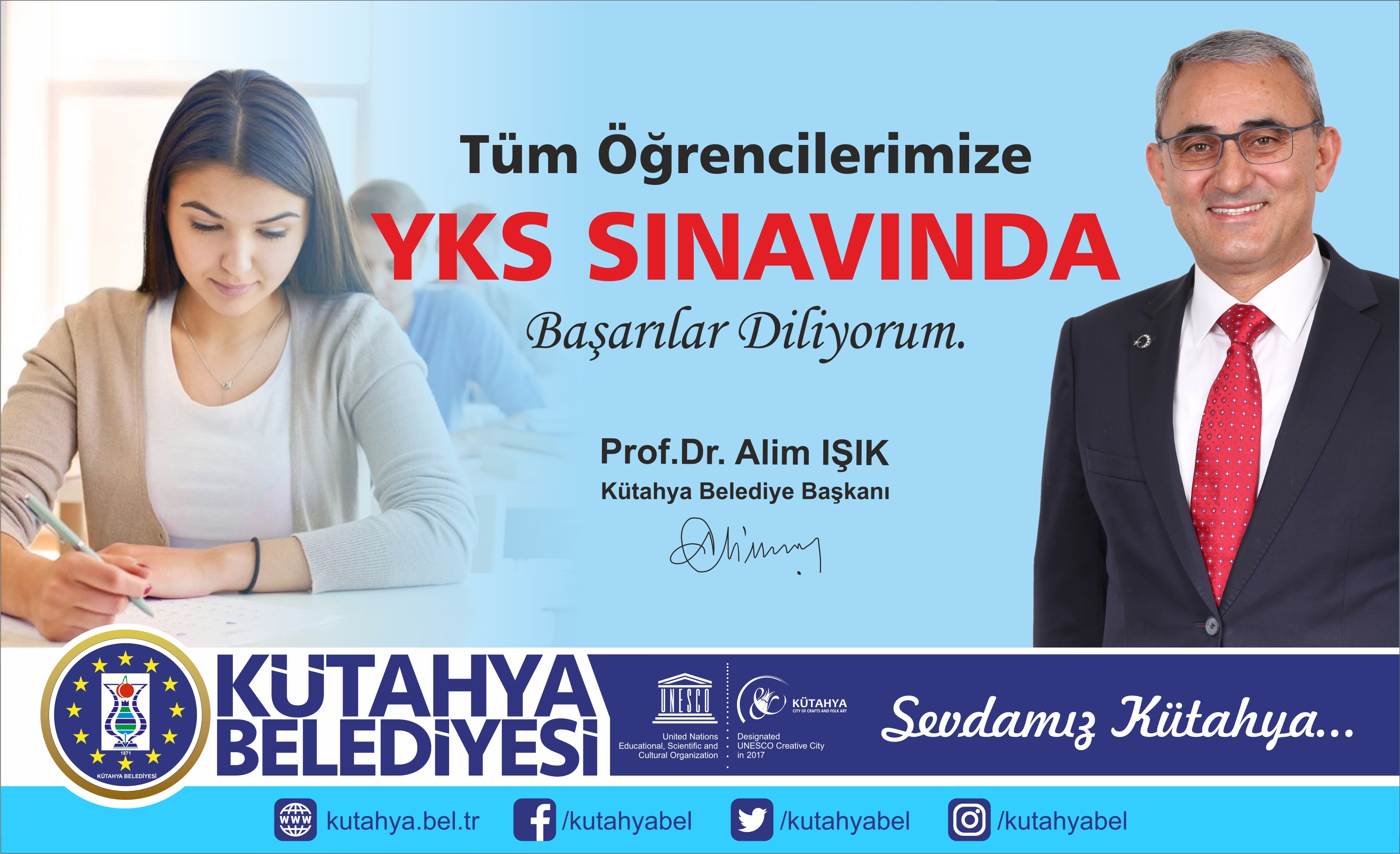 Kütahya Belediye Başkanı Prof. Dr. Alim IŞIK, hafta sonu yapılacak Yükseköğretim Kurumları Sınavı'na (YKS) girecek öğrencilere başarı diledi.IŞIK, yayımladığı mesajında, Kütahya Belediyesi olarak hafta sonu yapılacak sınavlar için bir dizi tedbir aldıklarını belirtti.