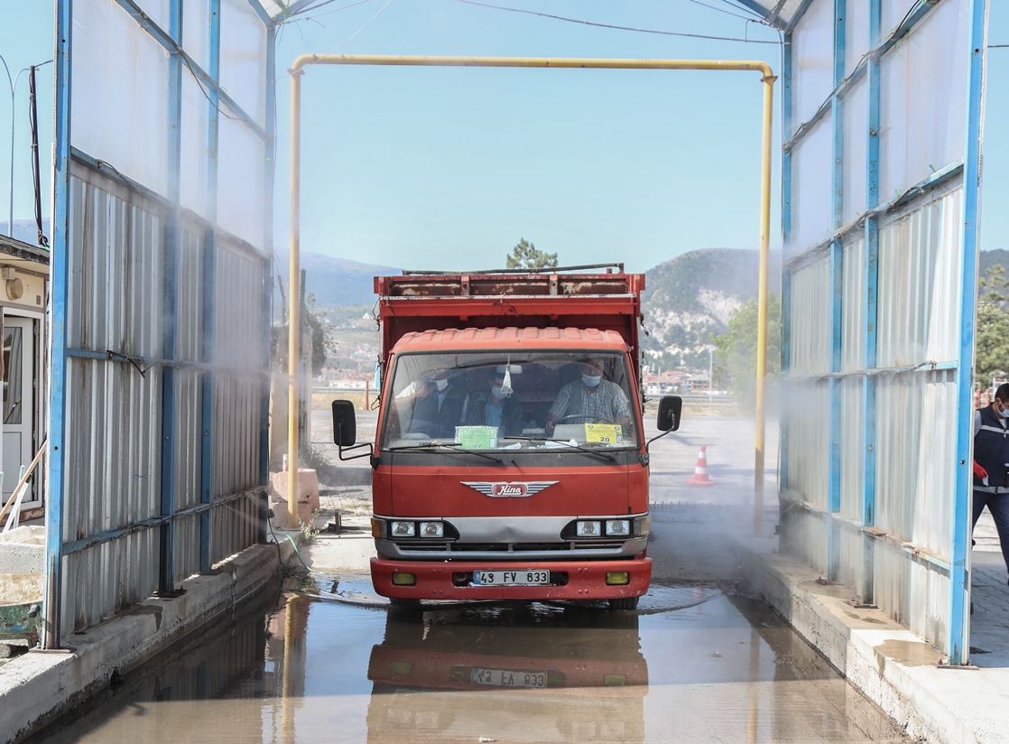 Kütahya Belediyesi Canlı Hayvan Pazarına giriş yapan her aracı dezenfekte eden ekipler, pazar içerisinde ise 18 farklı noktaya el yıkama ve el dezenfektan istasyonu yerleştirdi.