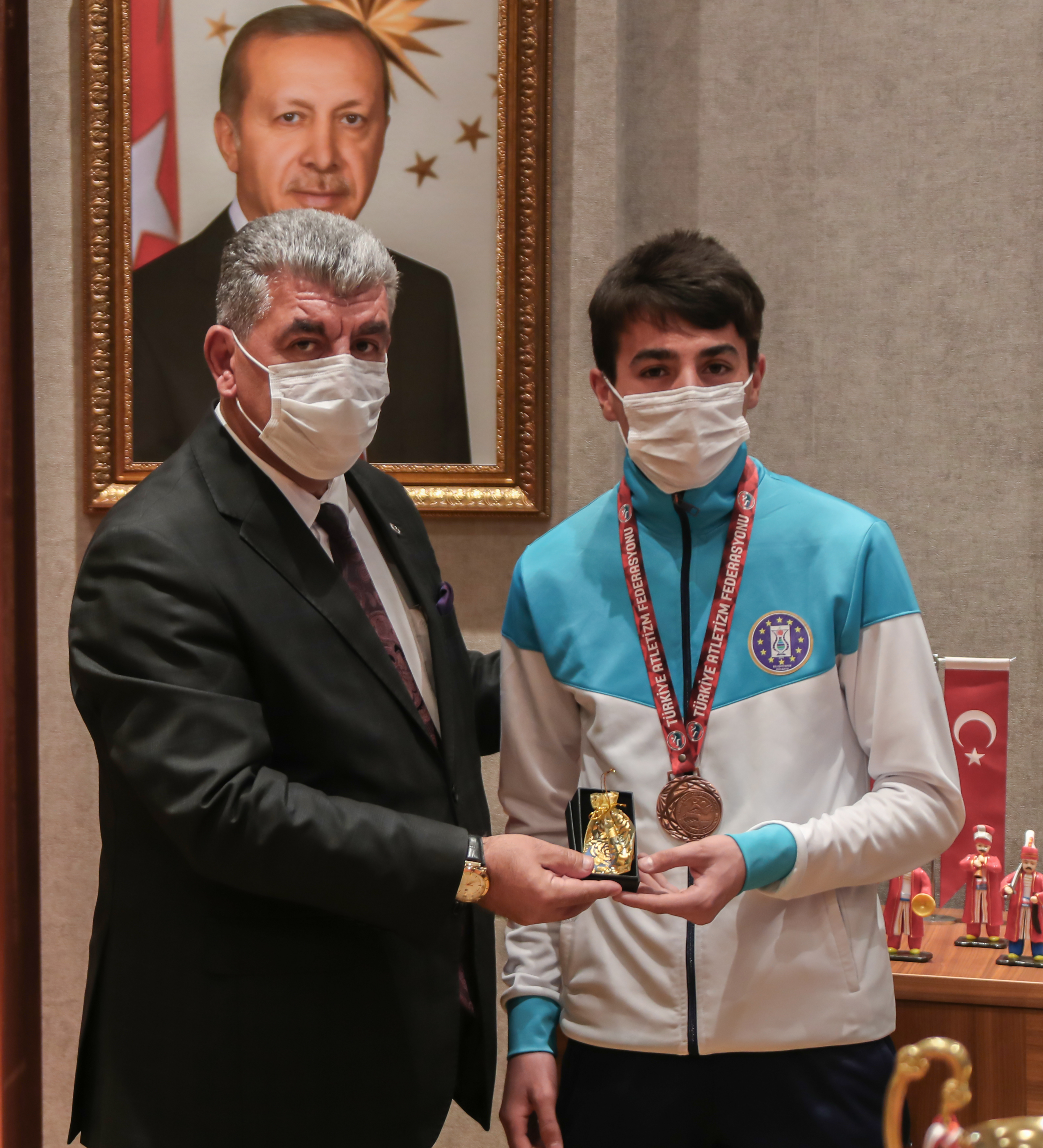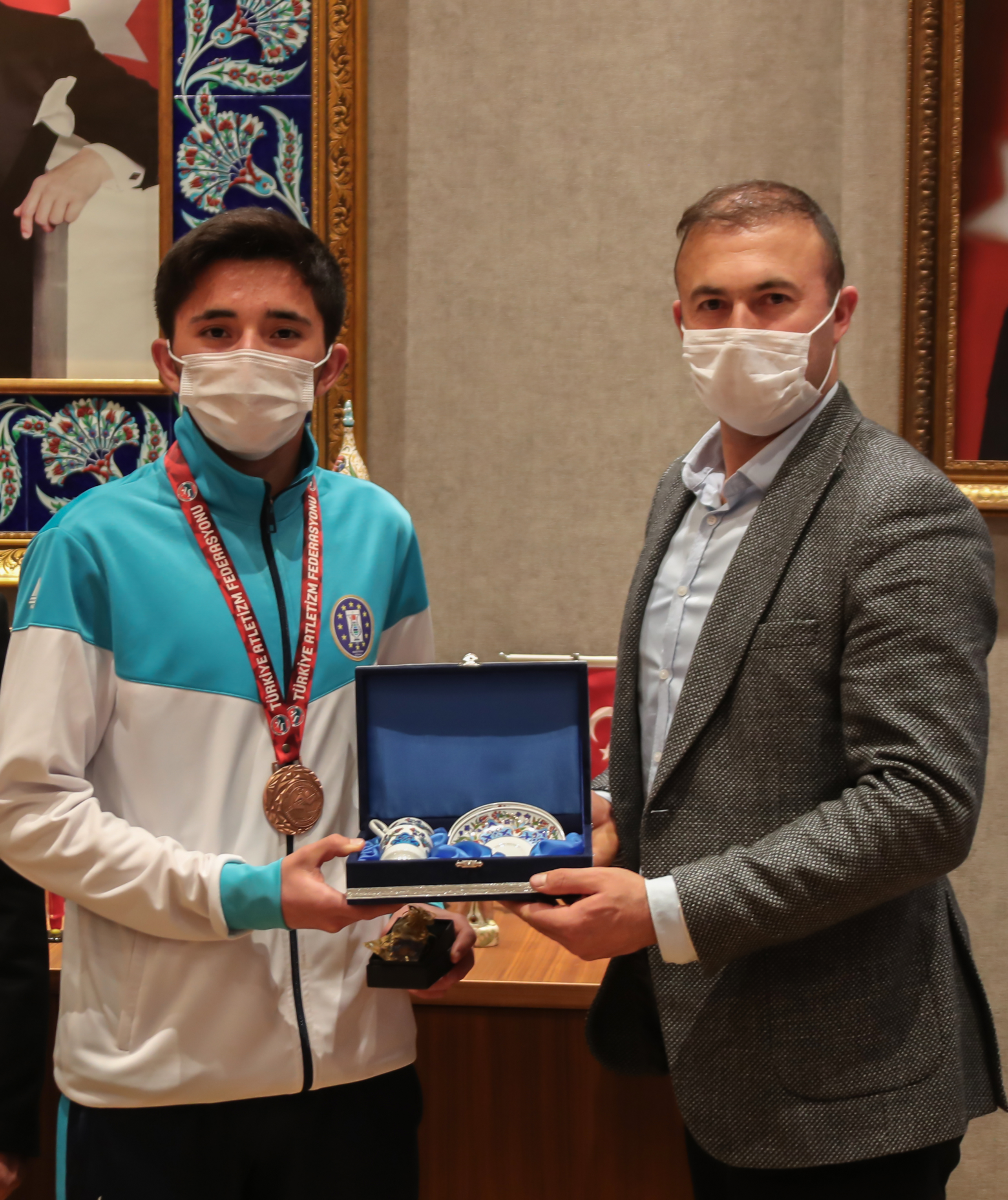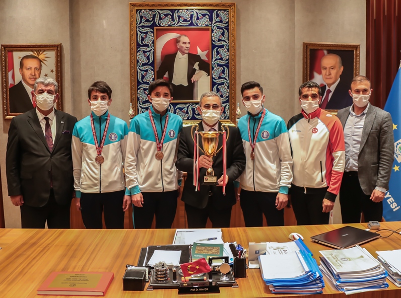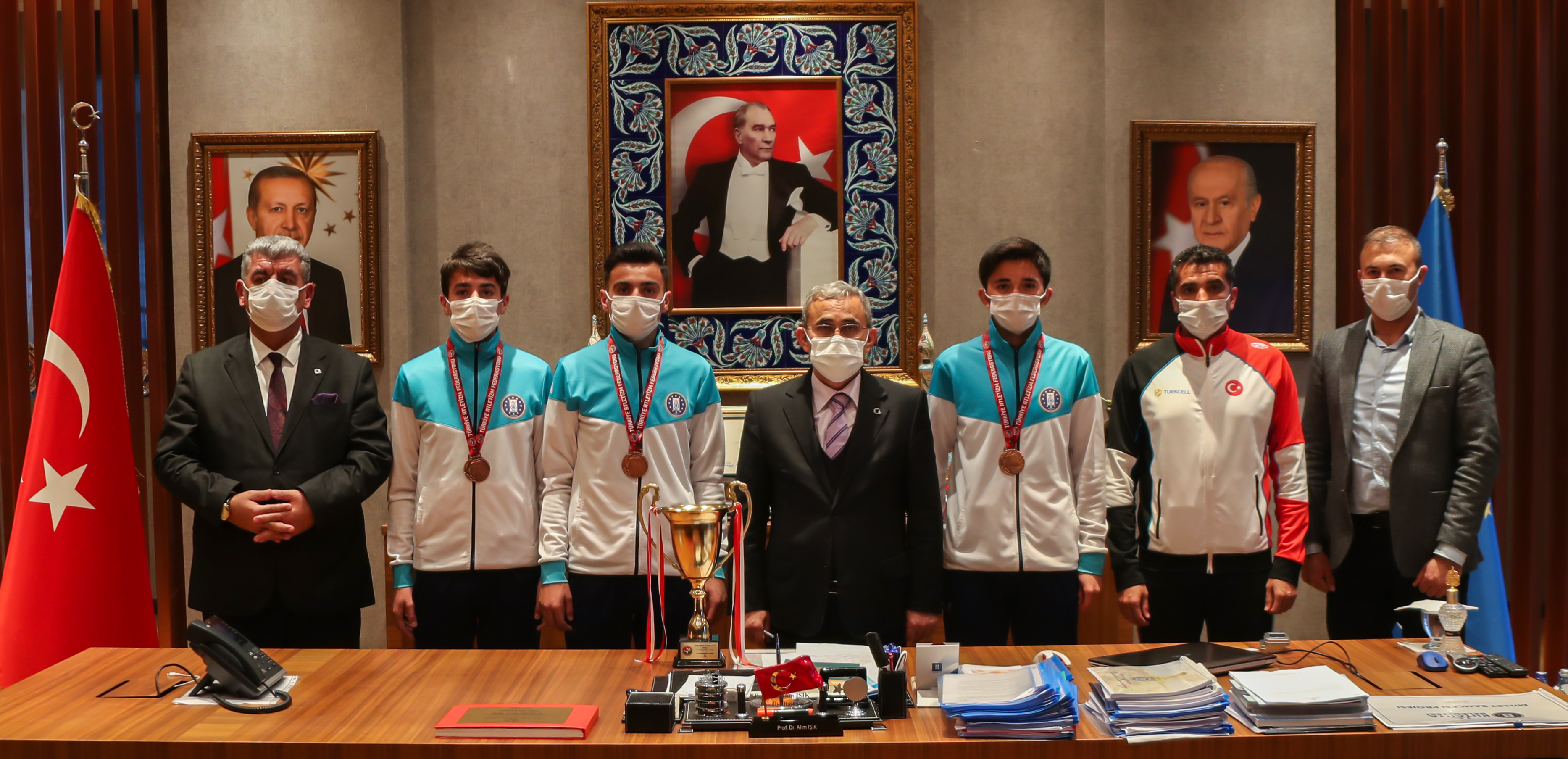 Kütahya Belediyespor Atletizm takımı Türkiye Şampiyonasında ilimizi temsil ettiler. Yapılan yarışmada Türkiye 3. olan atletizm takımını Belediye Başkanı Prof. Dr. Alim Işık makamında kabul ederek ödüllendirdi.Adana’da düzenlenen Kulüpler Arası Yıldızlar (U18) Türkiye Şampiyonasına katılan Kütahya Belediyespor Atletizm takımı Türkiye 3.’sü oldu. Atletizm takımı sporcuları ve antrenörleri Belediye Başkanı Prof. Dr. Alim Işık’ı makamında ziyaret etti. Ziyarette genç sporcuların başarılarını dileyen Başkan Işık, sporcuları ödüllendirdi. Başkan Işık yaptığı açıklamada “İlimiz adına çok güzel ve sevindirici olay için buradayız. 16 Aralık 2020 tarihinde Ankara’da yapılan Kulüpler Arası Yıldız (U18) Bölgesel Kros Liginde Kütahya Belediyespor Kulübü atletizm takımımız ikincilik başarısını gösterdi. Ve bu başarı takımımıza Türkiye genelinde Kulüpler Arası Yıldızlar Türkiye Şampiyonasına katılma hakkı kazandırdı. 22 Aralık 2020 tarihinde Adana’da yapılan Kulüpler Arası Yıldızlar Türkiye Şampiyonasında Kütahya Belediye Spor Atletizm takımı olarak Türkiye 3. oldu. 18 takımın mücadele ettiği böyle bir yarışmada şehrimize ve belediyemize Türkiye 3.’lüğü kazandıran takımımızın değerli üyeleri Ali Rıza Ersoy, Murat Köse, Mehmet Ersoy ve antrenörleri İdris Güleç’e ayrı ayrı teşekkür ediyorum. Takımımızın bu noktaya gelmesinde büyük emekleri olan Belediyemiz Kültür Sosyal Hizmetler Müdürümüz ve ilgili başkan yardımcımız çok ciddi katkıda bulundu. Şehrimize ve ülkemize hayırlı olsun diyorum. Belediyemizin mütevazı ödüllerini sporcularımıza ve hocamıza vereceğiz. Başarılarının devamını diliyorum. Bundan sonra üstün başarılar ve uluslararası yarışmalarda yine belediyemiz adına başarıları umut ediyoruz” dedi.