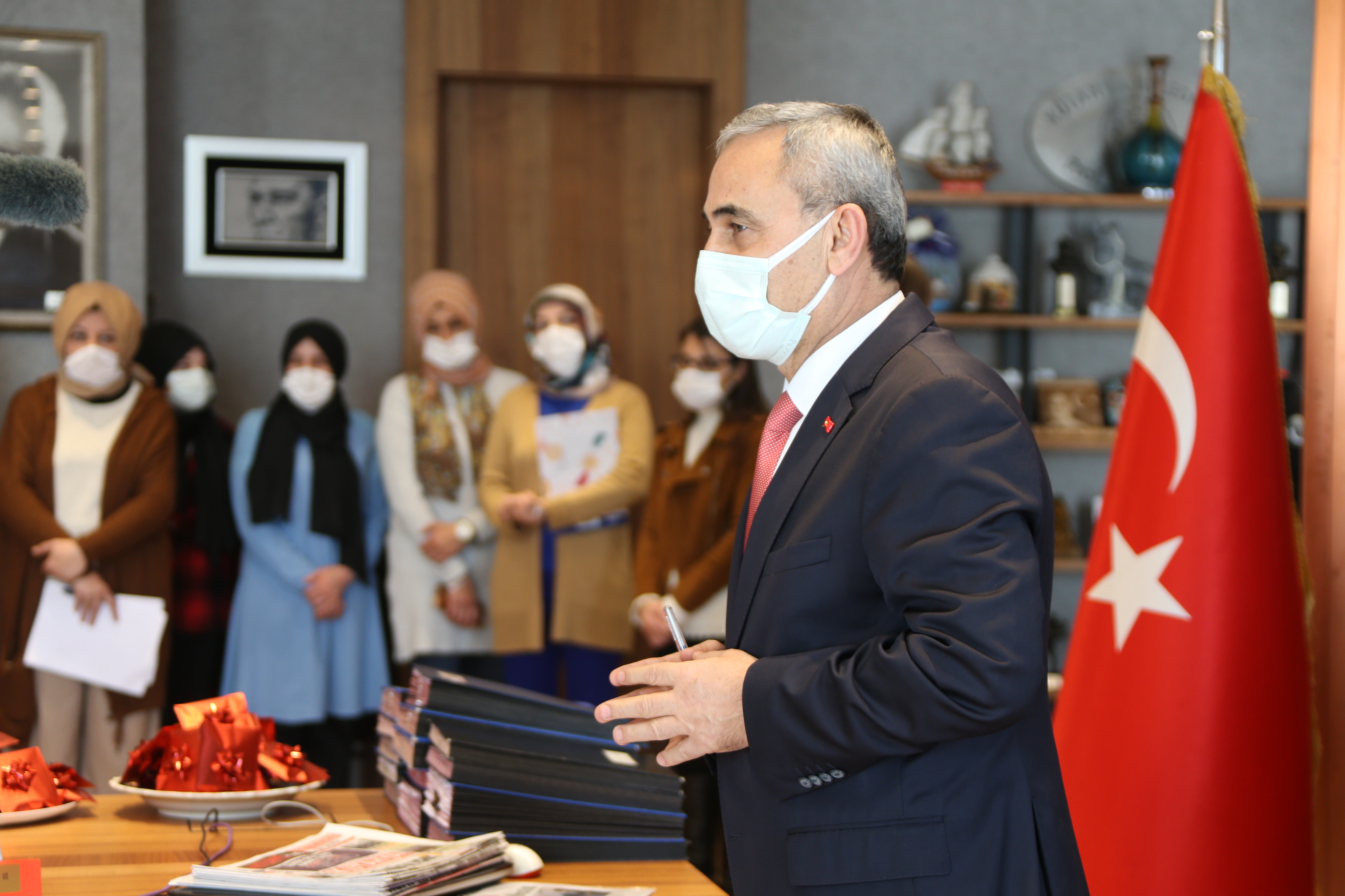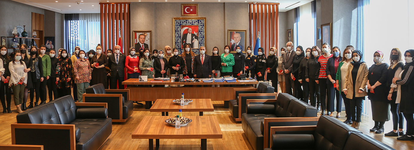 Kütahya Belediyesi Kadın ve Aile Hizmetleri Müdürlüğünün organize ettiği 8 Mart Dünya Kadınlar Günü kutlama programında, Belediye Başkanı Prof. Dr. Alim Işık kadın çalışanlarla makamında bir araya geldi. Başkan Işık, kadın çalışanlara ay yıldızlı kolye hediye etti. Belediye Başkanı Prof. Dr. Alim Işık, Kütahya Belediyesi Kadın ve Aile Hizmetleri Müdürlüğünün organize ettiği 8 Mart Dünya Kadınlar Günü kutlama programında, makamında kadın çalışanlarla bir araya geldi. kadınların Türk İslam kültüründe ayrı bir yeri olduğunu hatırlatan Başkan Işık, “Kütahya Belediyesinin çok kıymetli kadın çalışanları ve değerli mesai arkadaşlarım. Böyle bir günde, sizlerle bir araya gelmenin ne kadar önemli olduğunu biliyoruz. Kadınlarımız, günlük hayatta belki çok fazla kendisine değer verilmediğini düşünebilir. Kadınlarımızın değeri için, kadın varsa erkek var diyebiliriz. Kadın olmadan anne olunmuyor. Anne olmadan çocuk olmuyor. Çocuk olmadan da yuva olmuyor. Türk İslam kültürünün en önemli değerlerinden birisi aile. Aileyi de hepimizin bildiği gibi az bireyden oluşan, birbiri ile bağlantılı insanlar kümesi olarak tanımlıyoruz. Sadece eşler ailenin direkleri ama, aile değil. Çocuk olur ise aile başlıyor. Çocuk olması için önce anne olması lazım. Anne olması içinde kadın olması gerekiyor. Değeriniz çok farklı. İş hayatında, ailede, toplumun her kesiminde kadınlarımızın ne kadar aktif görev aldığını görürsek, erkekler olarak bizlerde hem yükümüzün azaldığının, hem de kadınımızın öne çıktığının farkına varıyoruz. Bu etkinlikte emeği geçen herkesi kutluyorum. Gününüz kutlu olsun. Kütahya Belediyesi sadece kadının değil, tüm çalışanlarının verdiği hizmetten yararlanan, vatandaşlarımızın hepsinin eşit ve birinci sınıf vatandaş olarak kabul edildiği bir kurumdur. Hizmet kalitemizi daha çok artıracağız. Ekip ruhu ile çalışarak, belediyemiz hizmetlerinin daha nitelikli hale getirilmesinden dolayı verdiğiniz hizmetten dolayı teşekkür ediyorum” dedi.