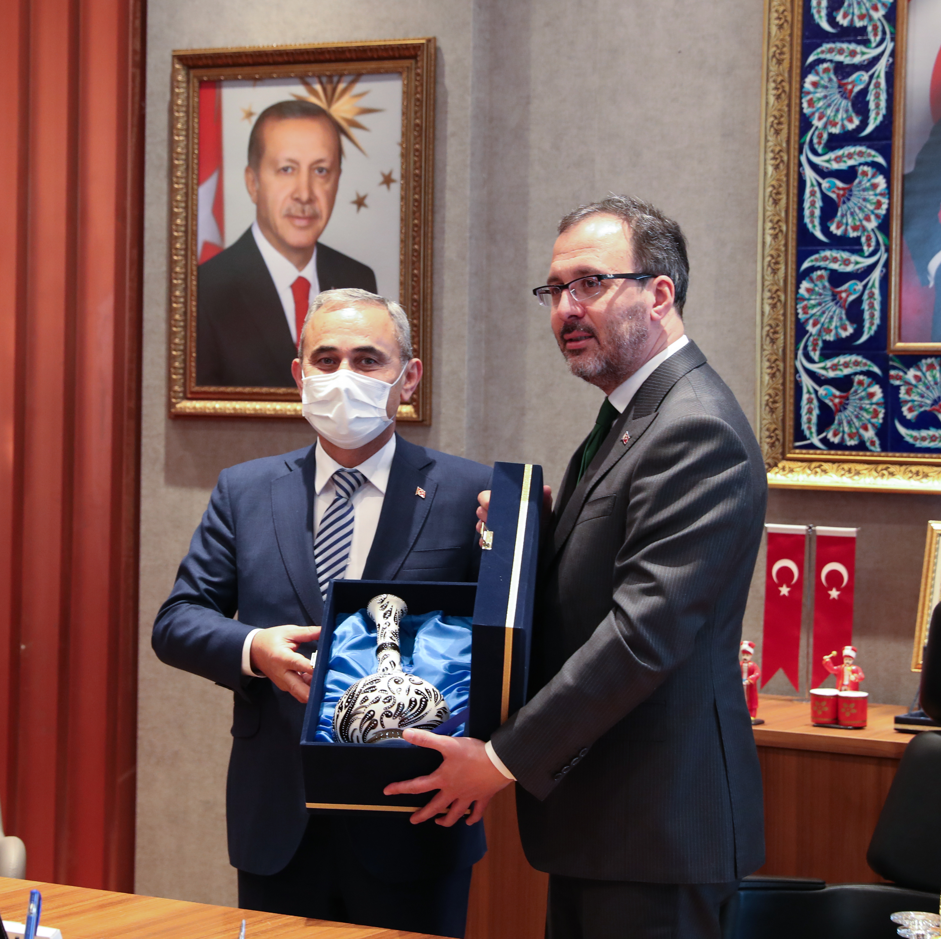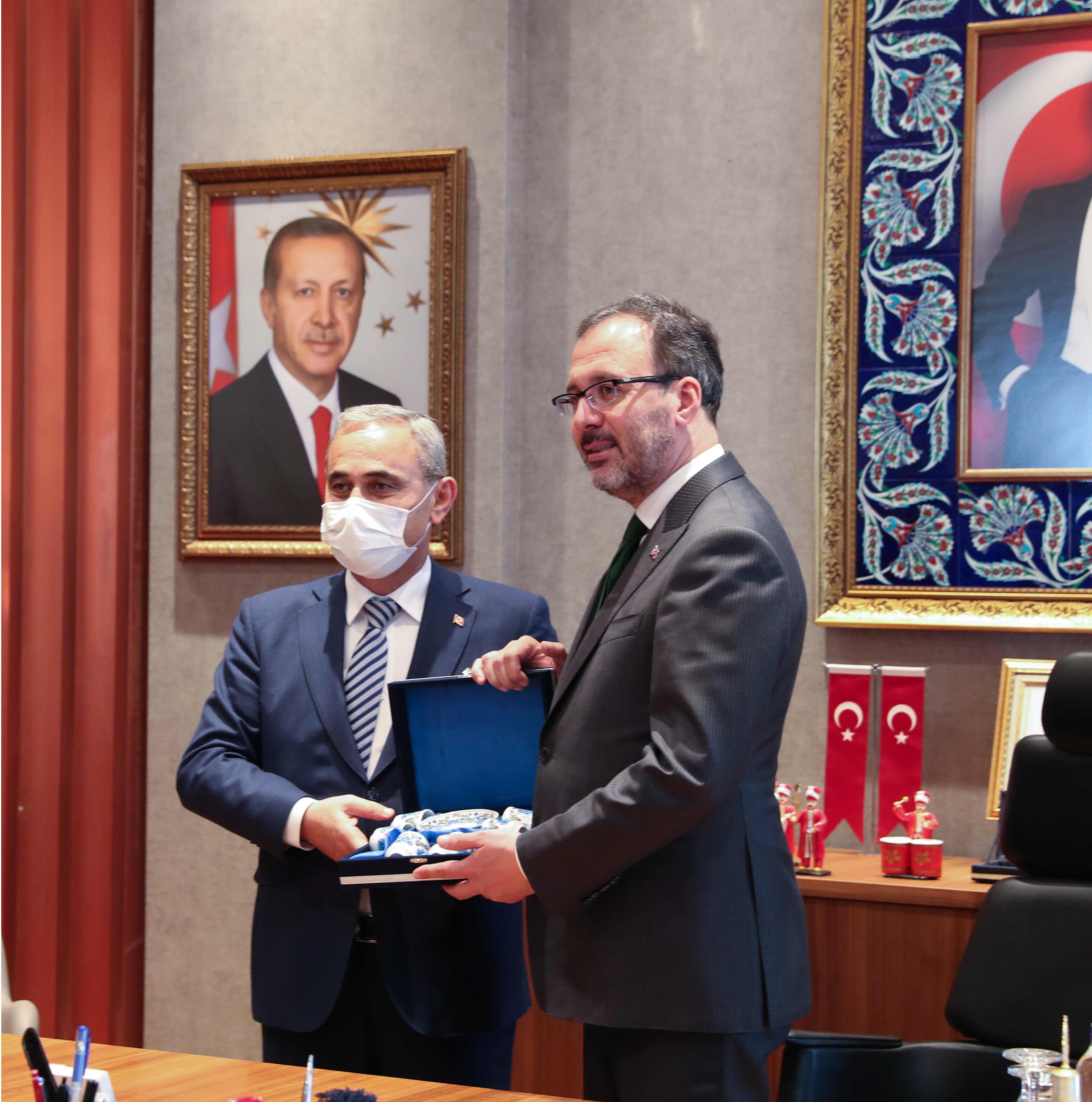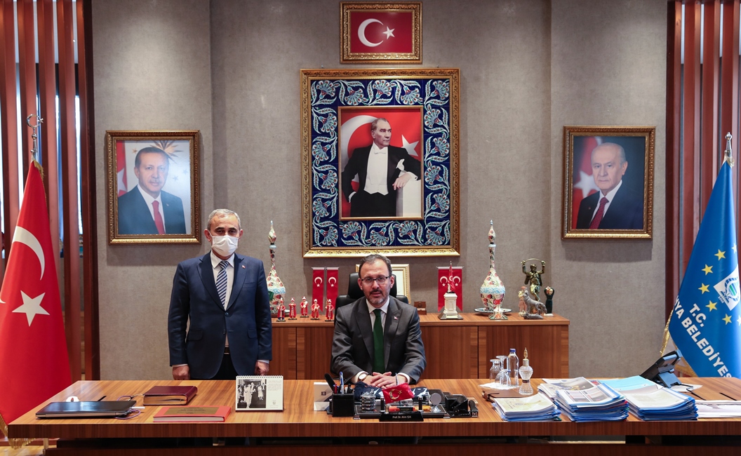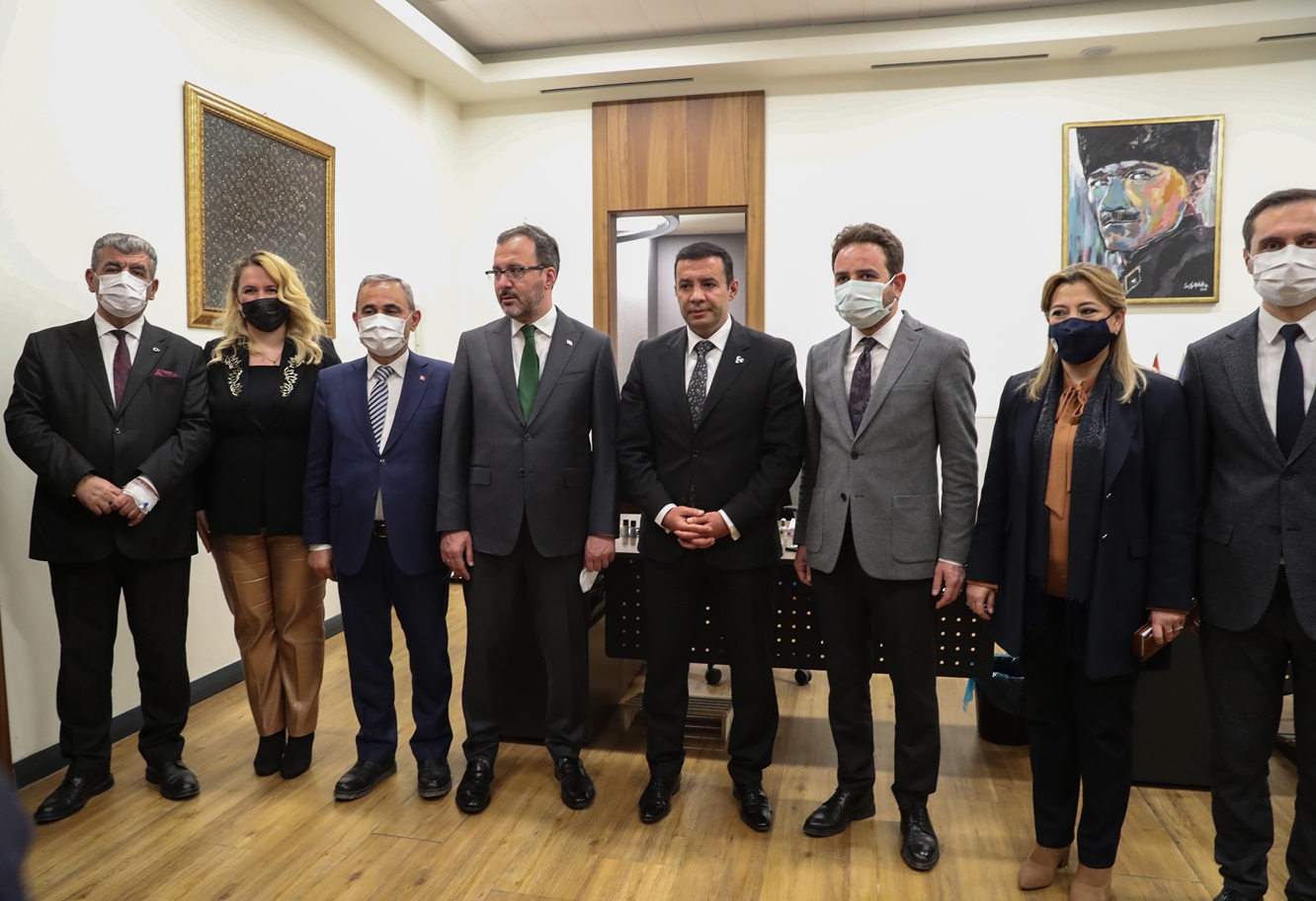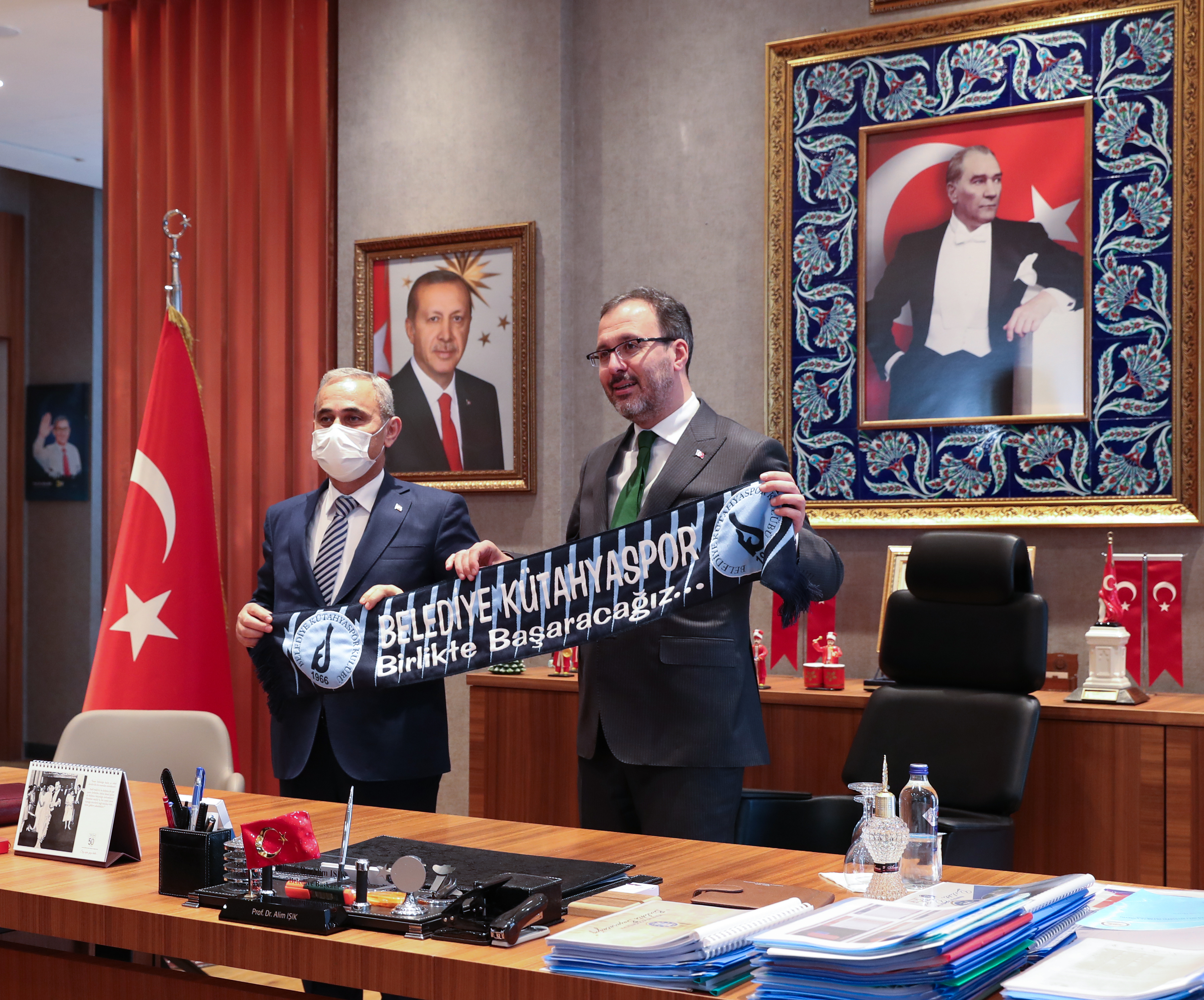 Kapalı yüzme havuzu açılışı ve incelemeler için Kütahya’ya gelen Gençlik ve Spor Bakanı Mehmet Muharrem Kasapoğlu, Kütahya Belediye Başkanı Prof. Dr. Alim Işık’ı makamında ziyaret etti.Akkent Mahallesine yapılan kapalı yüzme havuzu açılışı ve ilçe ziyaretleri için Kütahya’ya gelen Gençlik ve Spor Bakanı Mehmet Muharrem Kasapoğlu, Kütahya Belediye Başkanı Prof. Dr. Alim Işık’ı makamında ziyaret etti. Başkan Işık, Bakan Kasapoğlu’na ziyarette Belediye Kütahyaspor atkısı hediye etti. Kütahyaspor atkısını Bakan Kasapoğlu’nun boynuna takan Başkan Işık, Belediye Kütahyaspor’un ligde başarılı bir sezon geçirdiğini söyledi. Başkan Işık, Bakan Kasapoğlu’na, Kütahyalıların uzun yıllardır hayalini kurduğunu ve talep ettiği stadyum konusunu bir kez daha gündeme getirdi.