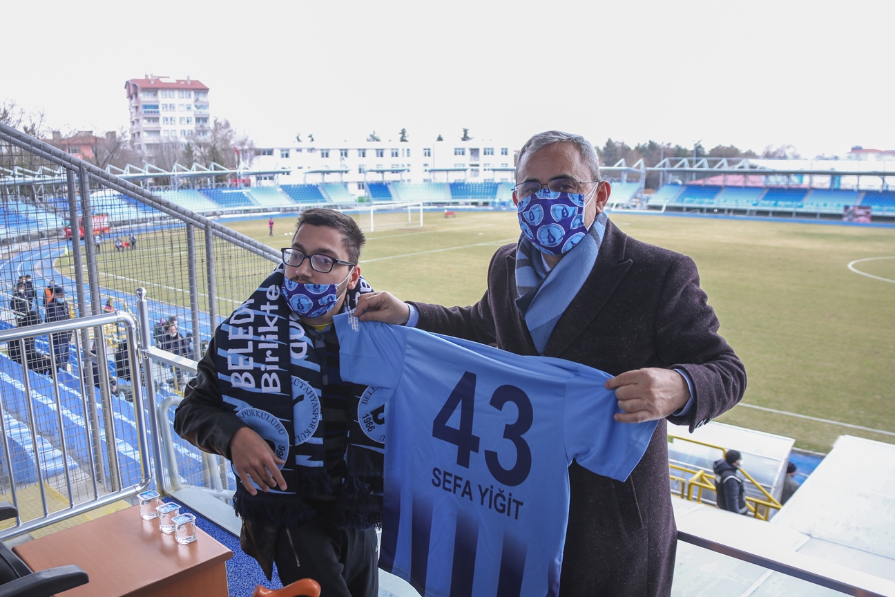 Sıkı bir Belediye Kütahyaspor taraftarı olan Sefa Yiğit’in en büyük hayali, Kütahya Belediye Başkanı Prof. Dr. Alim Işık ile birlikte Mavi Şimşeğin maçını birlikte izlemekti. Bu isteğini sosyal medya üzerinden Başkan Işık’a ileten Sefa için hemen harekete geçen Başkan Işık, alınan özel izinler sonrasında Sefa’nın hayalini gerçeğe dönüştürdü.Çocukluğundan bugüne kadar sıkı bir Belediye Kütahyaspor taraftarı olan Sefa Yiğit’in hayali, Mavi Şimşeğin maçını Başkan Işık ile birlikte izlemekti. Geçtiğimiz haftalarda bu istediğini Başkan Işık’a sosyal medyadan ileten Sefa Yiğit’in hayali, Yomraspor maçında gerçeğe dönüştü. Yiğit’in, Yomraspor maçını tribünden izlemesi için özel izinler alındı. Evinden, babası ile birlikte belediye ekipleri tarafından alınarak Dumlupınar Stadyumuna getirilen ve protokol tribününde Başkan Işık’ın yanına oturan Sefa Yiğit, karşılama öncesinde Başkan Işık ile takım ve şampiyonluk hakkında sohbet etti. Kütahya Belediye Başkanı Prof. Dr. Alim Işık, Sefa Yiğit’e atkı ve adına özel forma hediye etti.