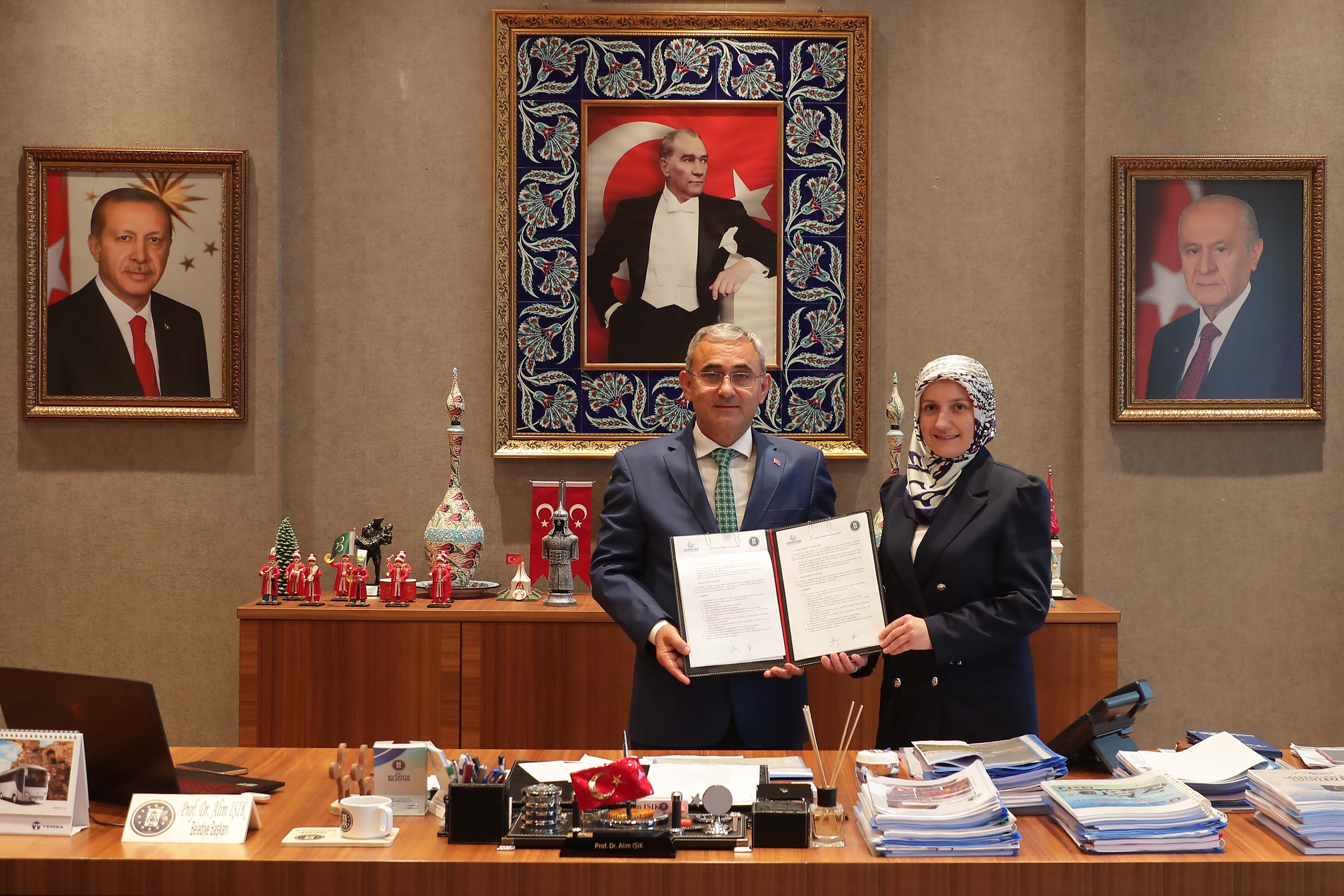 Kütahya Belediyesi çalışanlarına yönelik çalışmaları devam ediyor. Son olarak Kütahya Belediye’miz ile Germiyan Ağız ve Diş Sağlığı Polikliniği arasında imzalanan protokolle çalışanlar ve birinci derece yakın akrabaları diş tedavilerinde belirli oranda indirim alacak. Belediye Başkanı Prof. Dr. Alim Işık’ın makamında gerçekleşen protokol imza töreninde konuşan Başkan Işık; “Bugün yine hayırlı bir hizmet için birlikteyiz. Germiyan Ağız ve Diş Sağlığı Polikliniği ile Kütahya Belediye’miz arasından belediyemizin çalışanlarına taahhüt edilen indirimleri kapsayan bir protokol imzalıyoruz. Öncelikle Germiyan Ağız ve Diş Sağlığı Polikliniği adına Diş Hekimi Zehra Öğüt Demirel ve çalışanlarına bize sağladıkları bu imkanlar için teşekkür ediyorum. Hayırlı uğurlu olsun. Çalışanlarımıza hayırlı olsun” dedi.