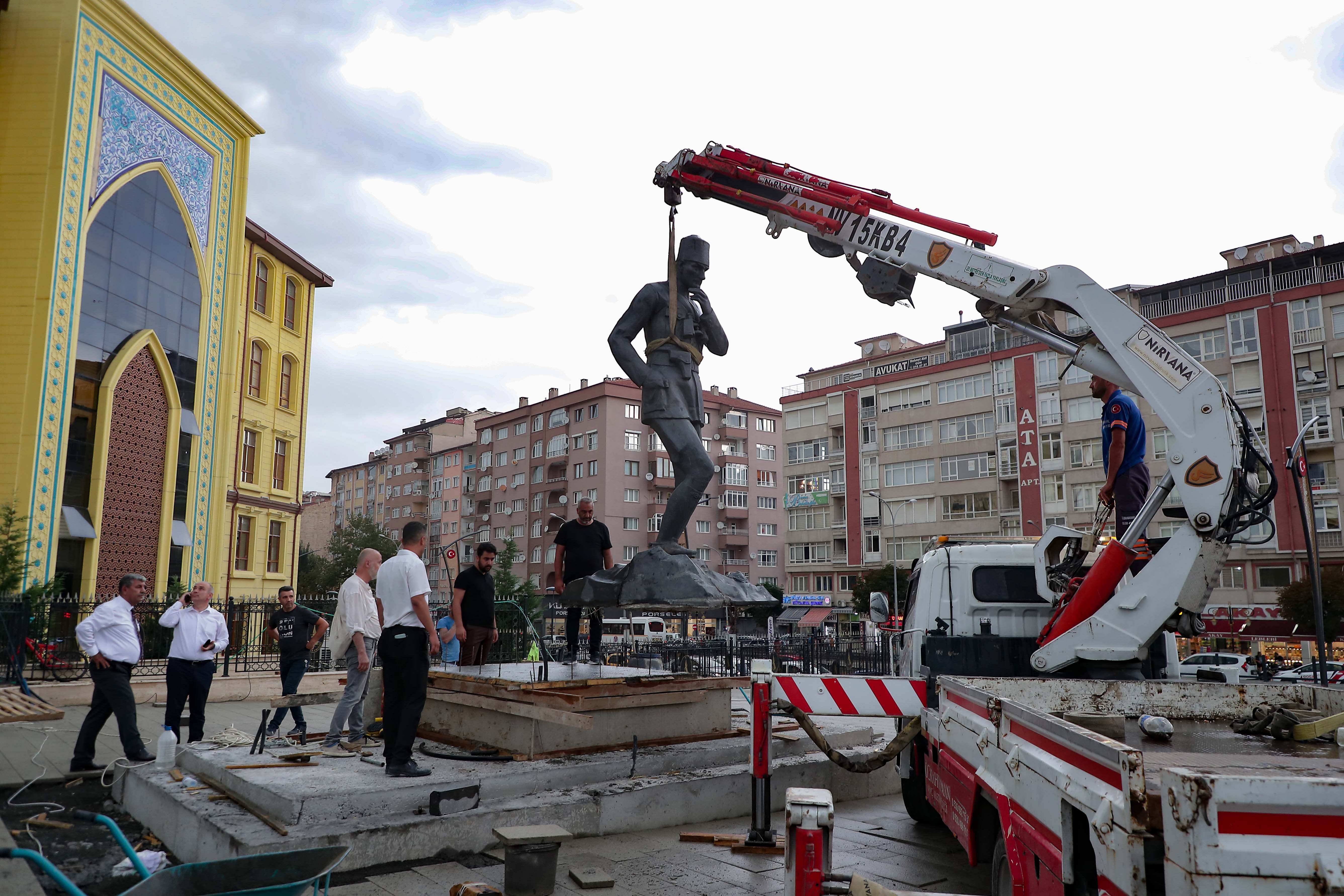 Zafer Meydanı Projesi imalat aşamasında geçici süre ile yerinden kaldırılan Ulu Önder Gazi Mustafa Kemal Atatürk’ün heykeli, meydandaki en güzel yerini aldı. Zafer Meydanı imalatı esnasında geçici süre ile yerinden kaldırılan Atatürk heykeli bugün yeniden yeni yerine konuşlandırılarak, meydandaki yerini aldı.