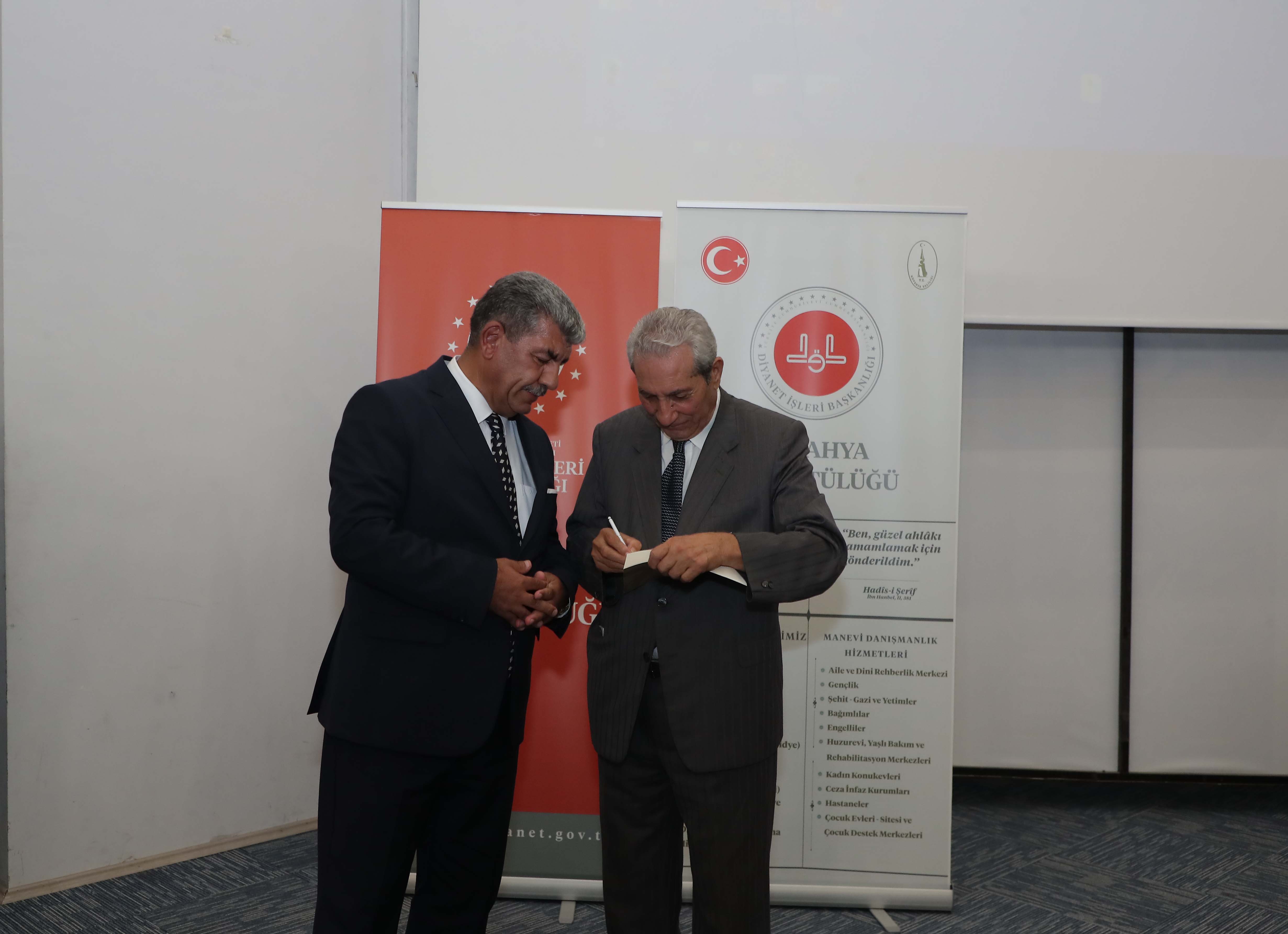 Prof. Dr. Sarı Koyuncu konferans sonrasında milli mücadele konulu kitabını imzalayarak protokol üyelerine takdim etti.