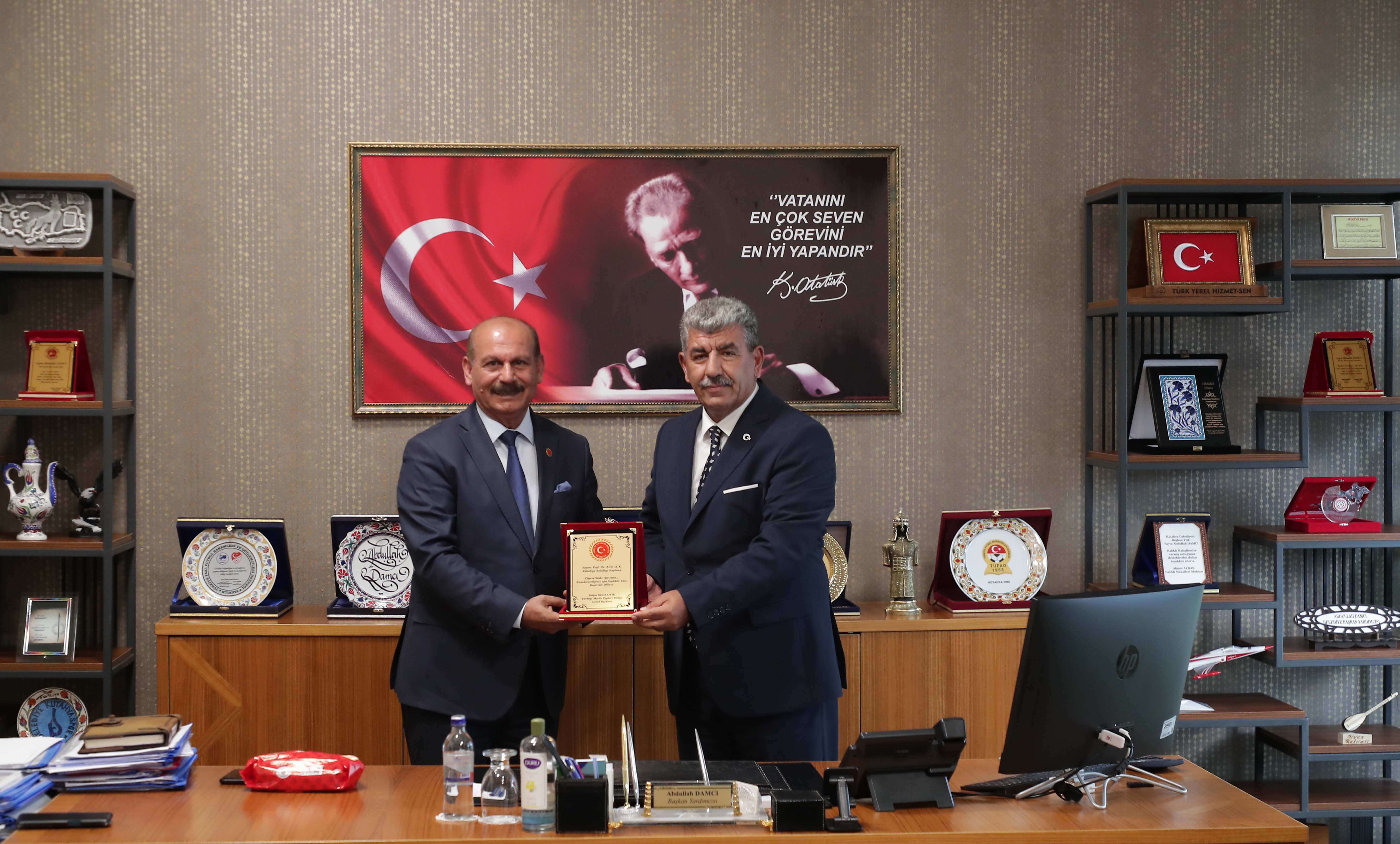 Birlik Genel Başkanı Yalçın Kocabıyık ziyaret anısı olarak, Belediye Başkanı Prof. Dr. Alim Işık adına hazırlanan plaketi Başkan Vekili Damcı’ya verdi.