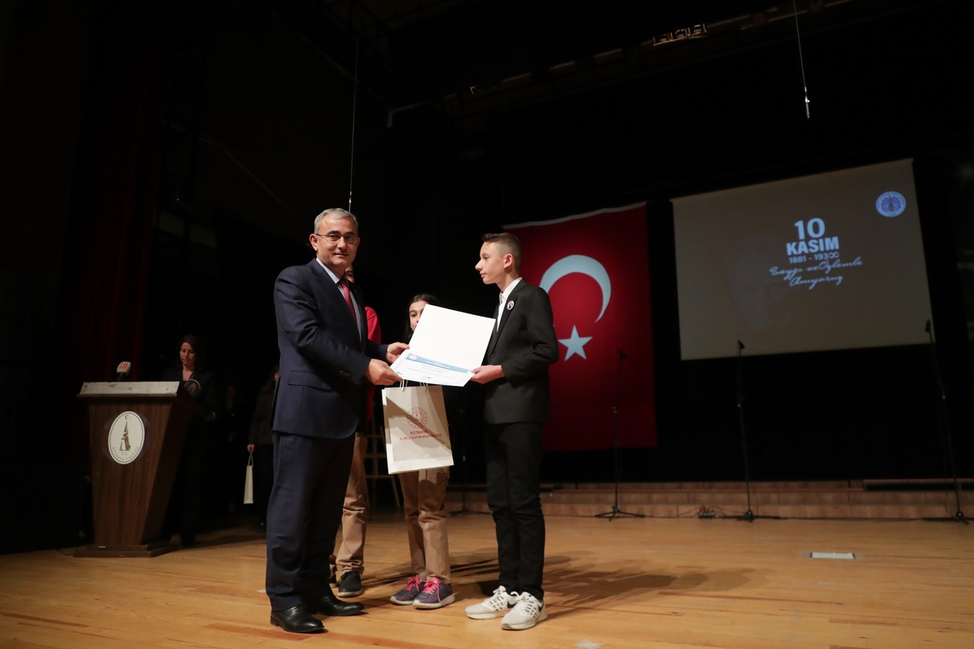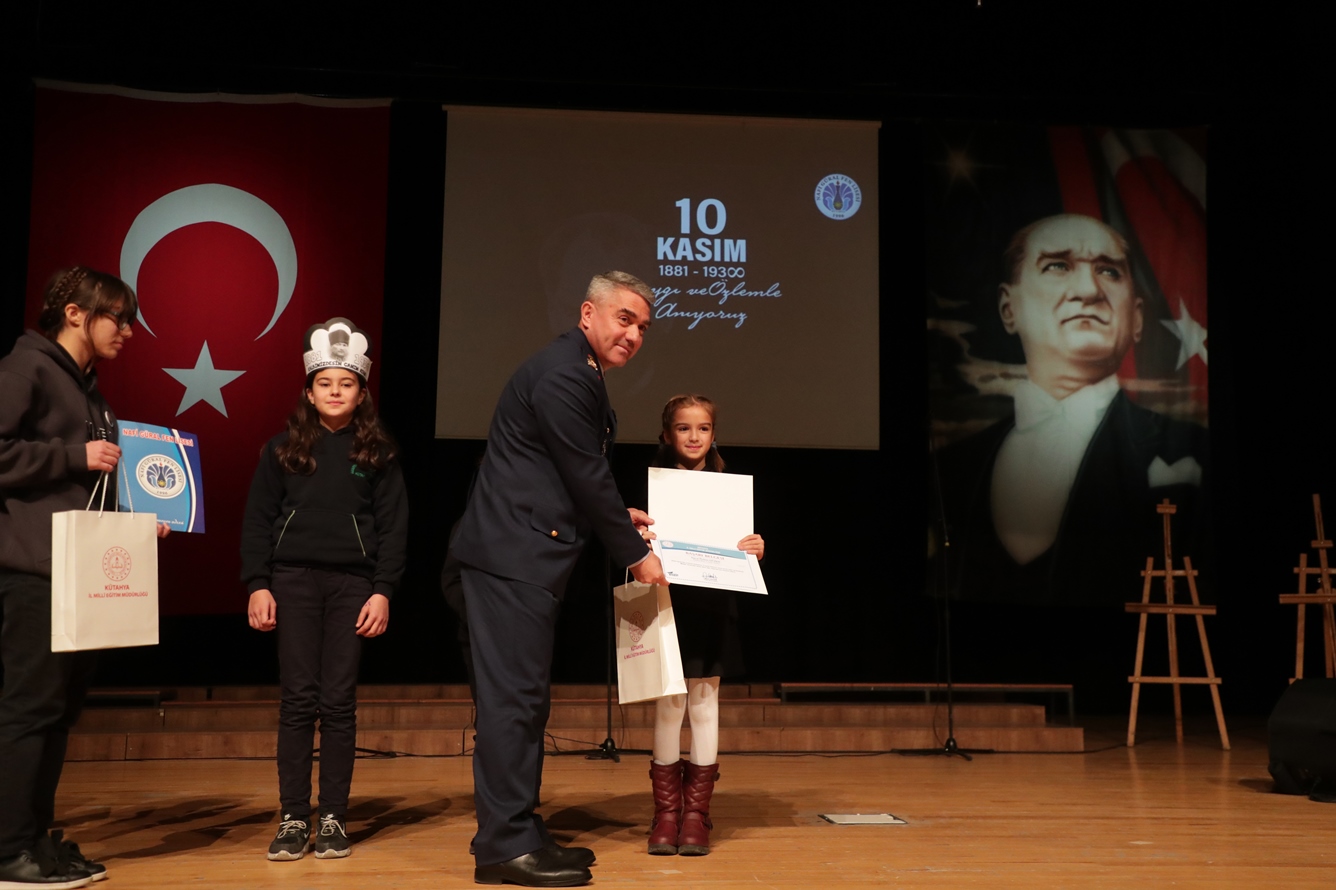Kütahya Belediye Başkanı Prof. Dr. Alim Işık, Hezar Dinari Kültür Merkezi’nde 10 Kasım Atatürk’ü Anma Günü Programı kapsamında düzenlenen anma törenine katıldı.Zafer Meydanı’nda yapılan çelenk sunumunun ardından Hezar Dinari Kültür Merkezi’nde, Nafi Güral Fen Lisesi tarafından Atatürk’ü Anma Programı düzenlendi. Programda, Ulu Önder Gazi Mustafa Kemal’in hayatını konu alan 10 Kasım oratoryosu ve öğrenciler tarafından çizilen Atatürk portresi izleyenler tarafından çok beğenildi. 10 Kasım etkinlikleri kapsamında düzenlenen yarışmalarda dereceye giren öğrencilere ödüllerini ve hediyelerini, Kütahya Valisi Ali Çelik, Kütahya Tugay ve Garnizon Komutanı Tuğgeneral Necati Gündüz ve Kütahya Belediye Başkanı Prof. Dr. Alim Işık’tan aldı.