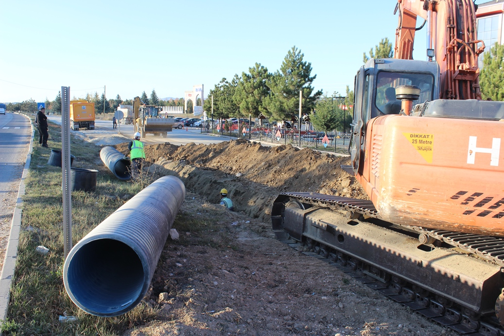 Kavşak çalışmaları kapsamında yapılan 300 metrelik yağmur suyu hattı işleminde 600’lük korge boru kullanılıyor. Mümkün olan en kısa sürede bitirilmesi planlanan çalışmanın sona ermesiyle, altyapısı güçlenen yerleşim yerlerine gelmesi muhtemel zararların önüne geçilecek.
