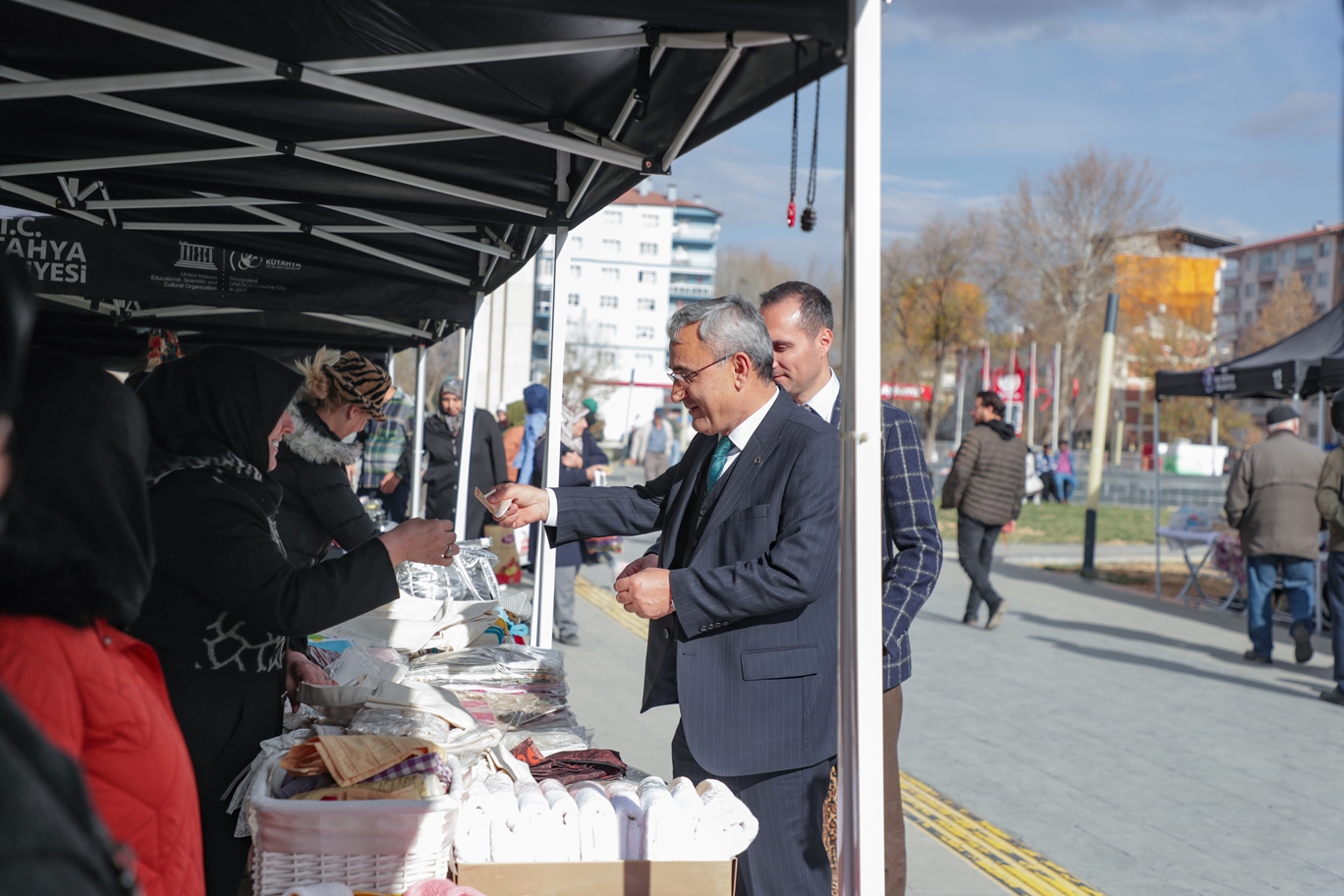 Kütahya Belediyesi önünde gerçekleşen kermes etkinliğine katılan Kütahya Belediye Başkanı Prof. Dr. Alim Işık, “Kütahya Belediyemizin öncülüğünde kurulan Kütahya Katılımcı Kadın Kooperatifi’mizin organizasyonuyla, Kütahya’daki kadınlarımız el emeği göz nuru veya yaptıkları küçük hediyelik eşyaları burada kermes yöntemiyle satışa sunuyor. Hepsini tek tek ziyaret ederek hayırlı işler diledik. Talep gelmesi halinde Kütahya’mızda bu tür etkinlikleri bundan sonra arttıracağız. Belediyemizin önü ücretsiz olarak, bu tür taleplere her zaman açıktır olmaya da devam edecektir” ifadelerini kullandı.