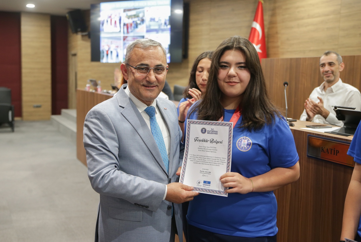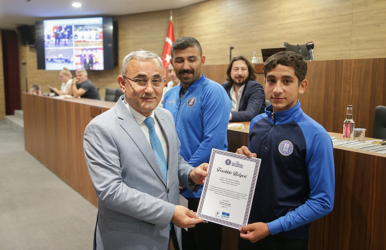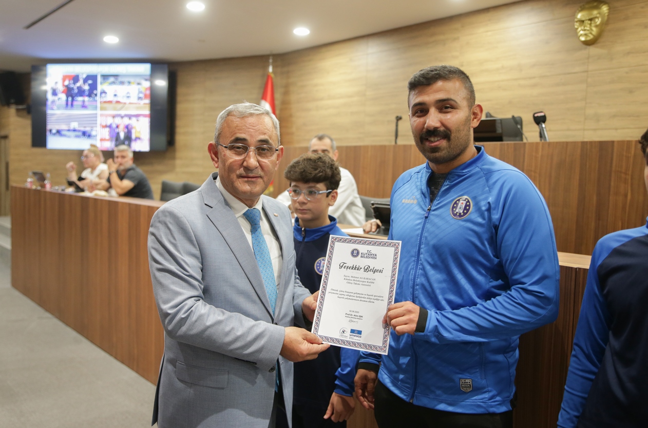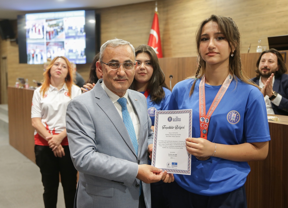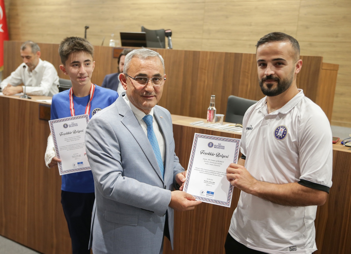 Belediye Başkanımız Prof. Dr. Alim Işık, Kütahya Belediyespor bünyesinde güreş, boks, halter, kick boks, oryantiring ve judo branşlarında başarı gösteren sporcularımızı ödüllendirdi. Kütahya Belediye Meclisi 5. Dönem 7. Olağan Toplantısı, Belediye Başkanımız Prof. Dr. Alim Işık başkanlığında yapıldı. Toplantı öncesi, Kütahya Belediyespor bünyesinde ulusal ve uluslararası şampiyonalara katılarak başarı gösteren sporcularımız, Belediye Başkanımız Prof. Dr. Alim Işık tarafından ödüllendirildi. Sporcularımızı tebrik eden ve ödüllerini takdim eden Başkanımız Işık, antrenörlerimize ve sporcularımızın ailelerine de özverileri ve fedakârlıkları için teşekkürlerini iletti.