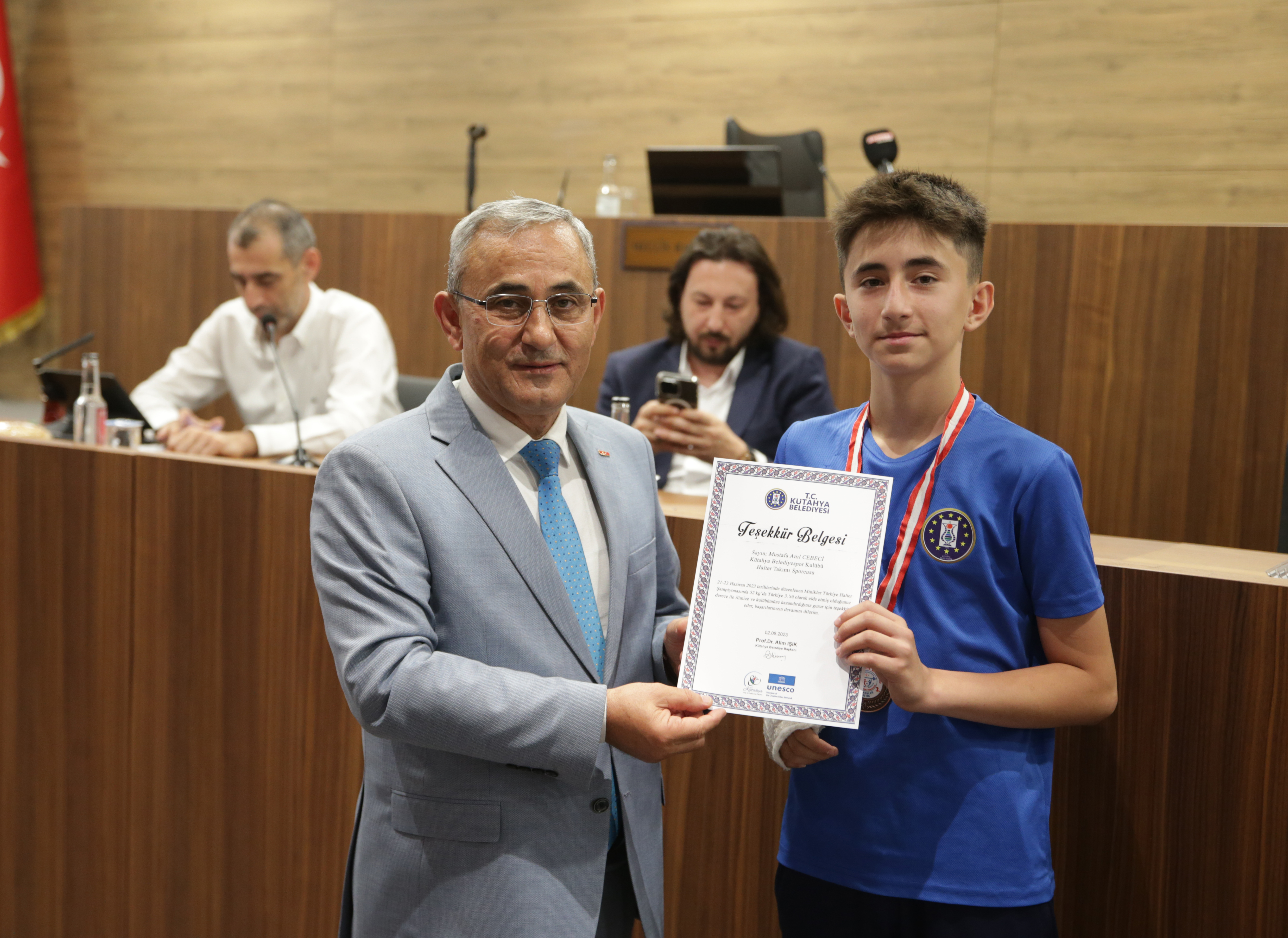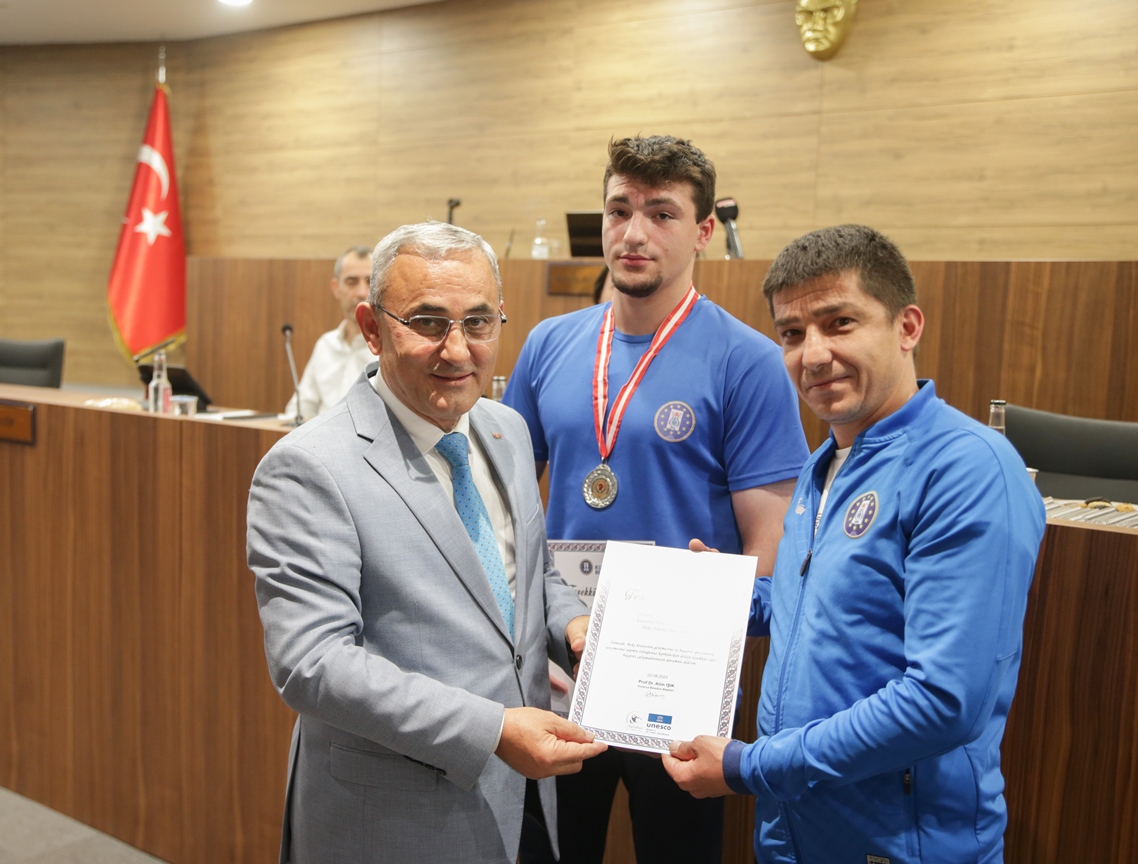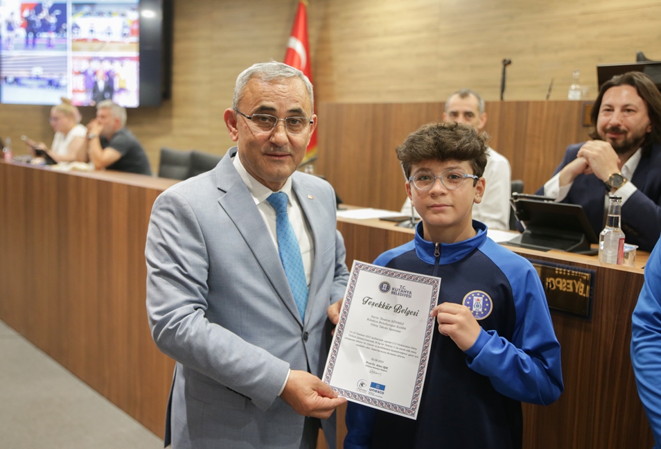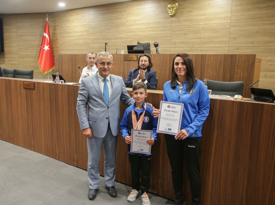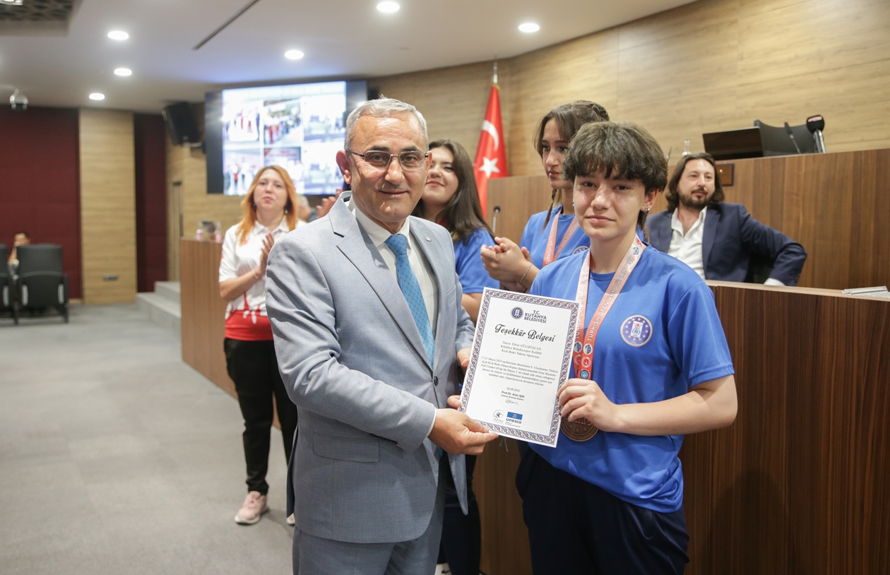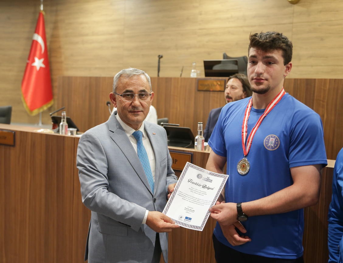 Belediye Başkanımız Prof. Dr. Alim Işık, Kütahya Belediyespor bünyesinde güreş, boks, halter, kick boks, oryantiring ve judo branşlarında başarı gösteren sporcularımızı ödüllendirdi. Kütahya Belediye Meclisi 5. Dönem 7. Olağan Toplantısı, Belediye Başkanımız Prof. Dr. Alim Işık başkanlığında yapıldı. Toplantı öncesi, Kütahya Belediyespor bünyesinde ulusal ve uluslararası şampiyonalara katılarak başarı gösteren sporcularımız, Belediye Başkanımız Prof. Dr. Alim Işık tarafından ödüllendirildi. Sporcularımızı tebrik eden ve ödüllerini takdim eden Başkanımız Işık, antrenörlerimize ve sporcularımızın ailelerine de özverileri ve fedakârlıkları için teşekkürlerini iletti.