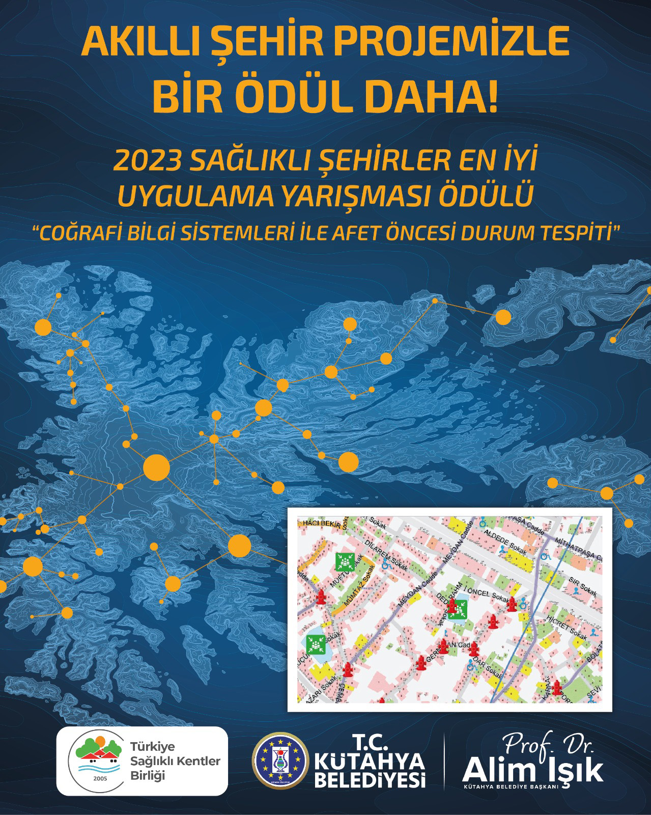 Kütahya Belediyemizin “Akıllı Şehir” kategorisinde yer aldığı “Coğrafi Bilgi Sistemleri İle Afet Öncesi Durum Tespiti” projesi, Sağlıklı Şehirler En İyi Uygulama Yarışması’nda ödüle layık görüldü. Hayata geçirdiği projeleriyle binlerce hemşehrimizin hayatını kolaylaştıran ve bu alanda yaptığı çalışmalar tarafsız kuruluşlarca birçok ödüle layık görülen Kütahya Belediyemiz, Belediye Başkanımız Prof. Dr. Alim Işık öncülüğünde geliştirdiği bir projeyle daha ödüle layık görüldü. Bu yıl 14’üncüsü düzenlenen, Türkiye Sağlıklı Kentler Birliği’ne üye 39 belediyenin 79 projeyle başvurduğu Sağlıklı Şehirler En İyi Uygulama Yarışması’nda “Akıllı Şehir” kategorisinde yer alan Kütahya Belediyemiz, “Coğrafi Bilgi Sistemleri İle Afet Öncesi Durum Tespiti” projesiyle ödülün sahibi oldu.