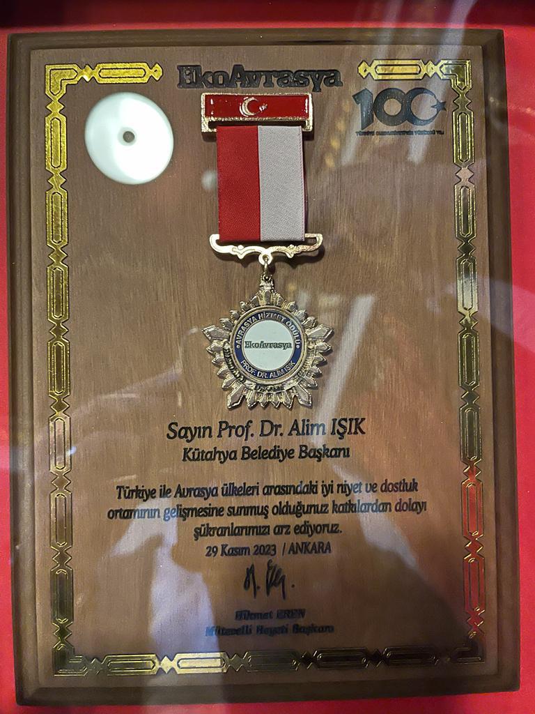 Kütahya Belediye Başkanımız Prof. Dr. Alim Işık, Avrasya Ekonomik İlişkiler Derneği tarafından Avrasya Hizmet Ödülü’ne layık görüldü. “Avrasya Hizmet Ödülleri” töreni, Avrasya Ekonomik İlişkiler Derneği (EkoAvrasya Vakfı) tarafından Ankara Resim ve Heykel Müzesi Tarihi Türk Ocağı Salonunda gerçekleştirildi. Saygı duruşu ve İstiklal Marşı'mızın okunmasıyla başlanan programa Yüksek Seçim Kurulu Başkanı Ahmet Yener, Kuzey Kıbrıs Türk Cumhuriyeti İçişleri Bakanı Dursun Oğuz, çok sayıda milletvekilli ve vatandaşlar katıldı.