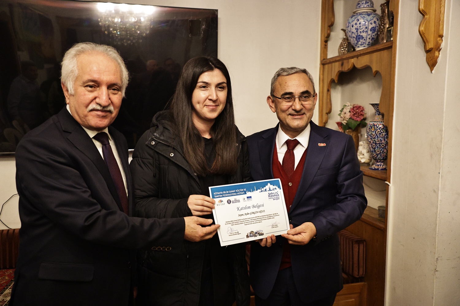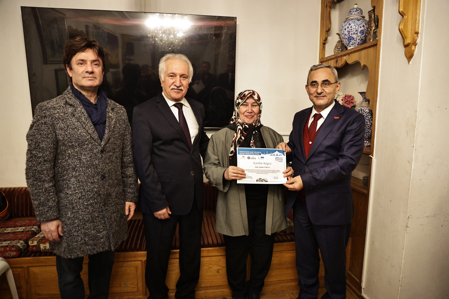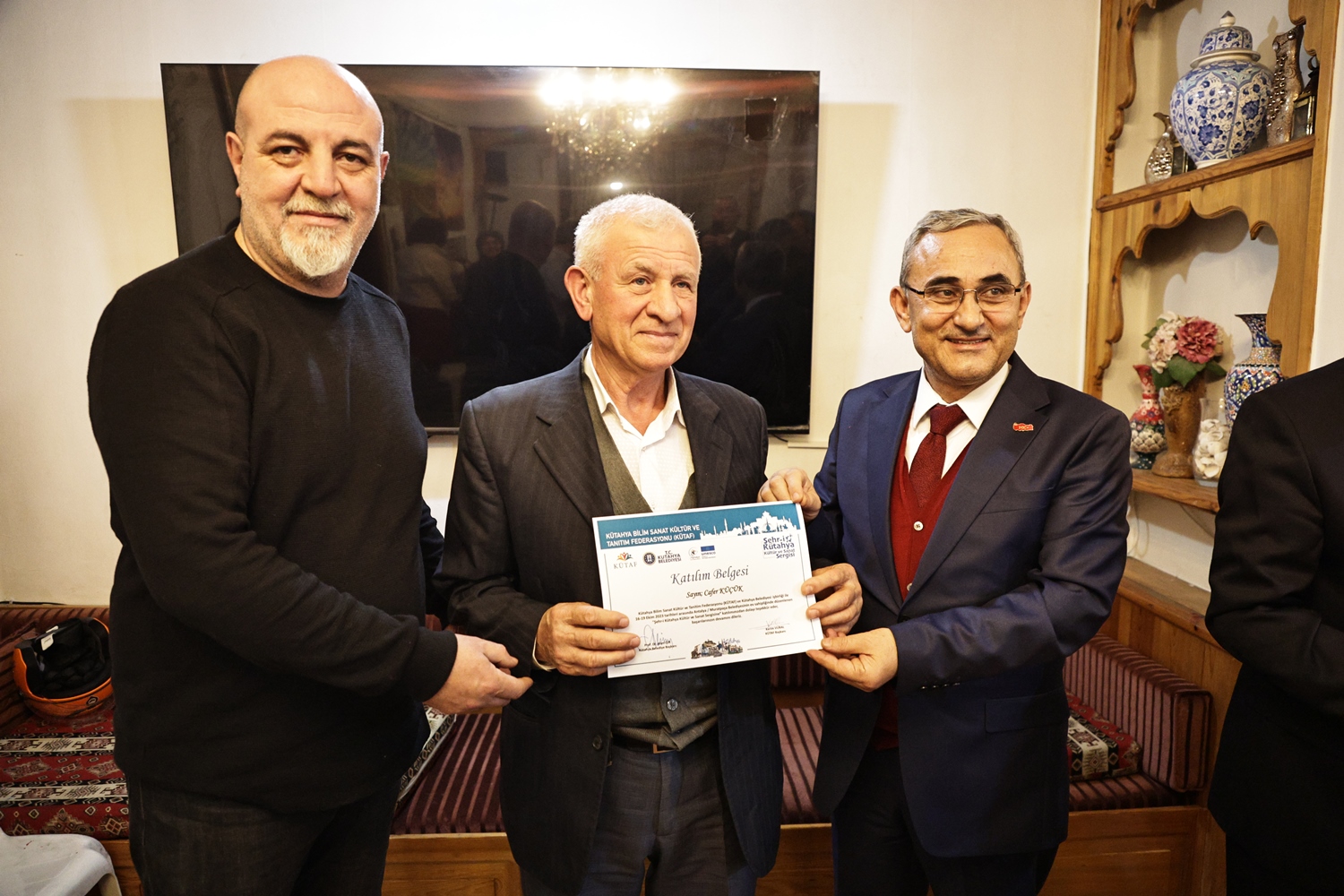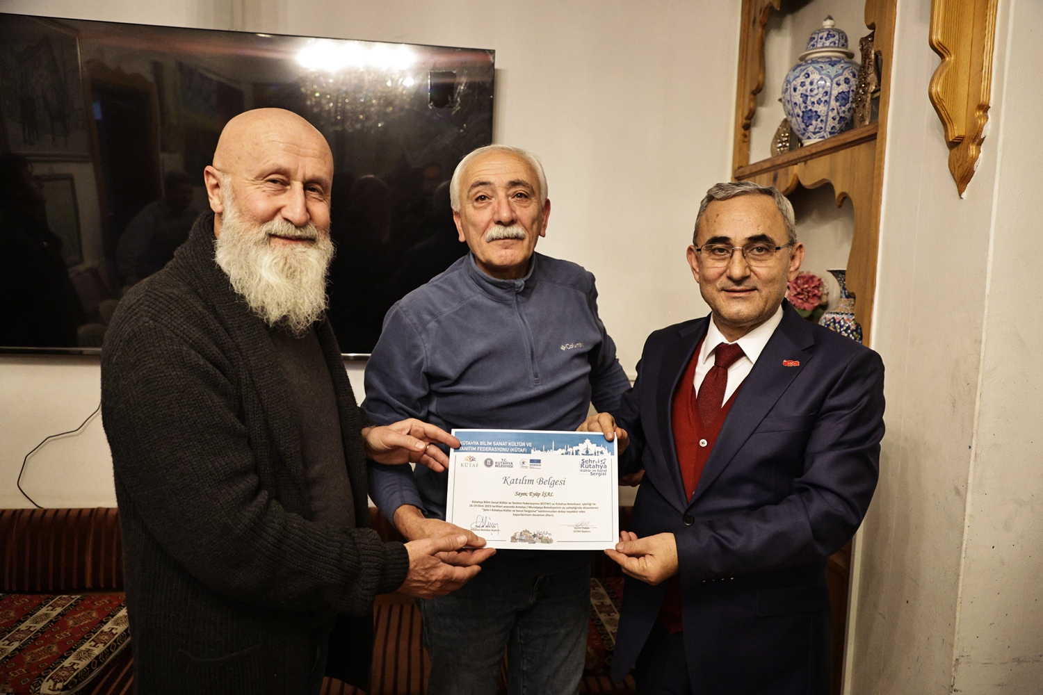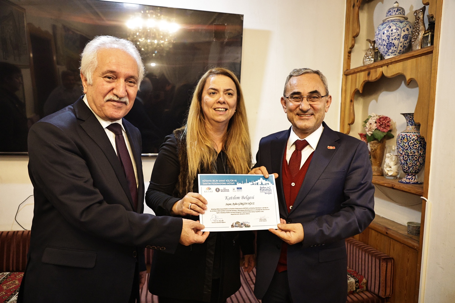 Yapılan sohbetin ardından Belediye Başkanımız Prof. Dr. Alim Işık, Kütahya Bilim, Sanat, Kültür ve Tanıtım Federasyonu Başkanı Kerim Vural ile birlikte Antalya’da Kütahya Belediyemizin destekleriyle gerçekleştirilen "Şehr-i Kütahya" Kültür ve Sanat Sergisinde emeği geçenlere teşekkür belgelerini takdim etti.