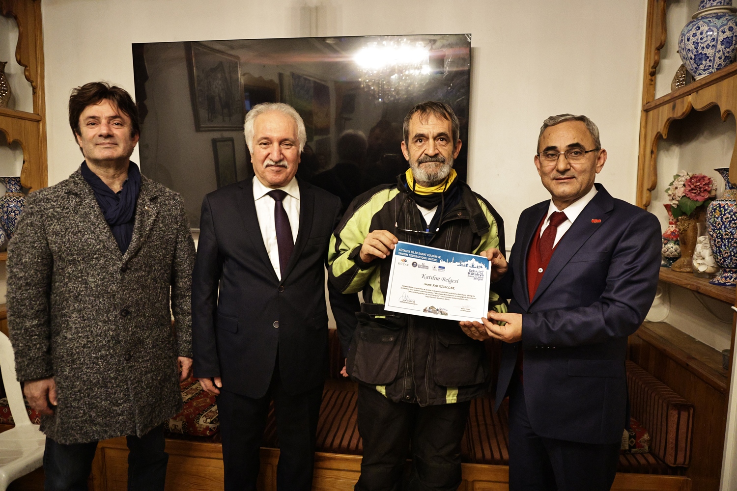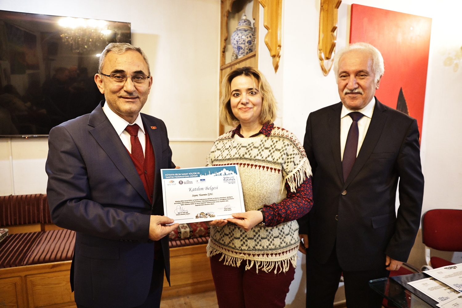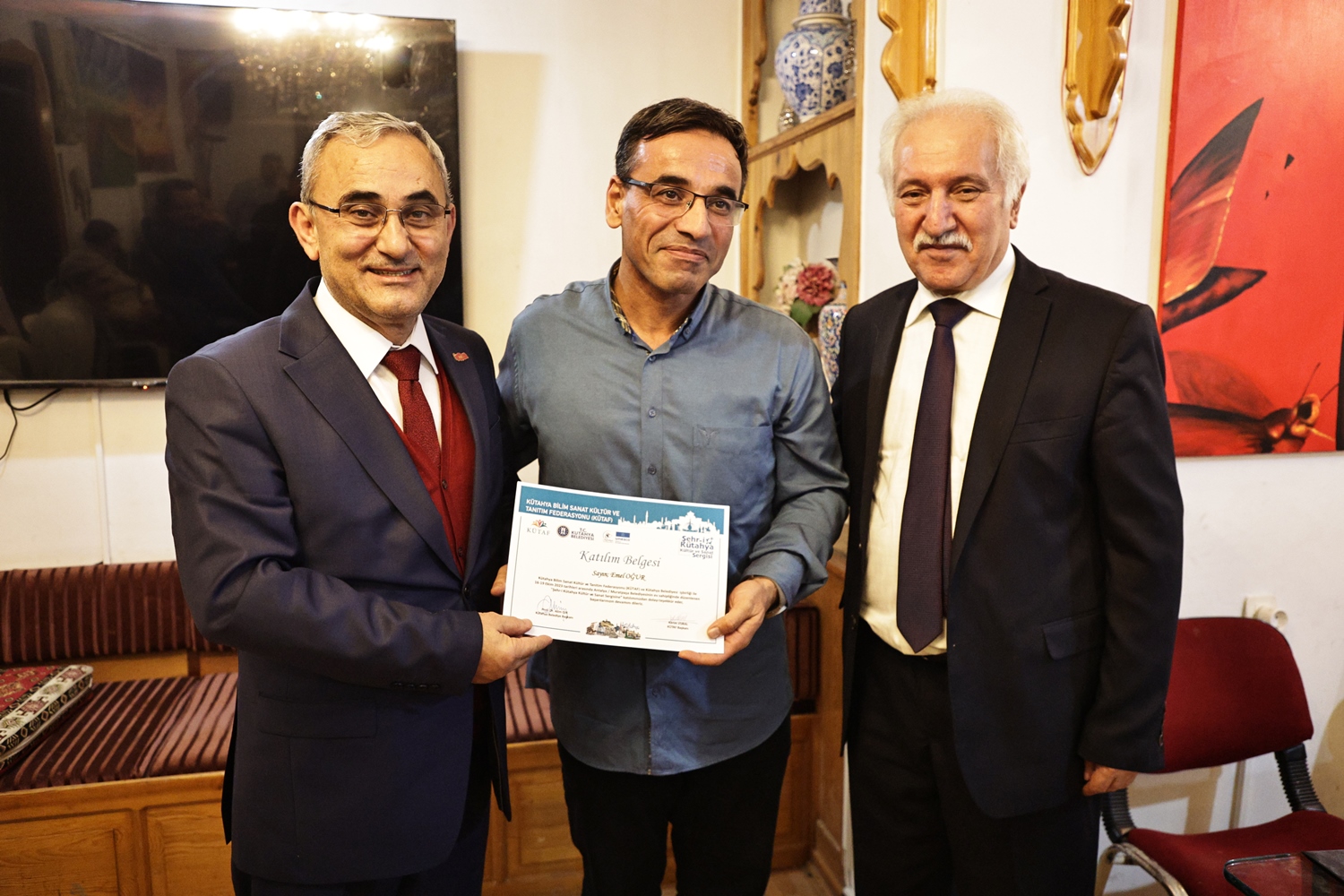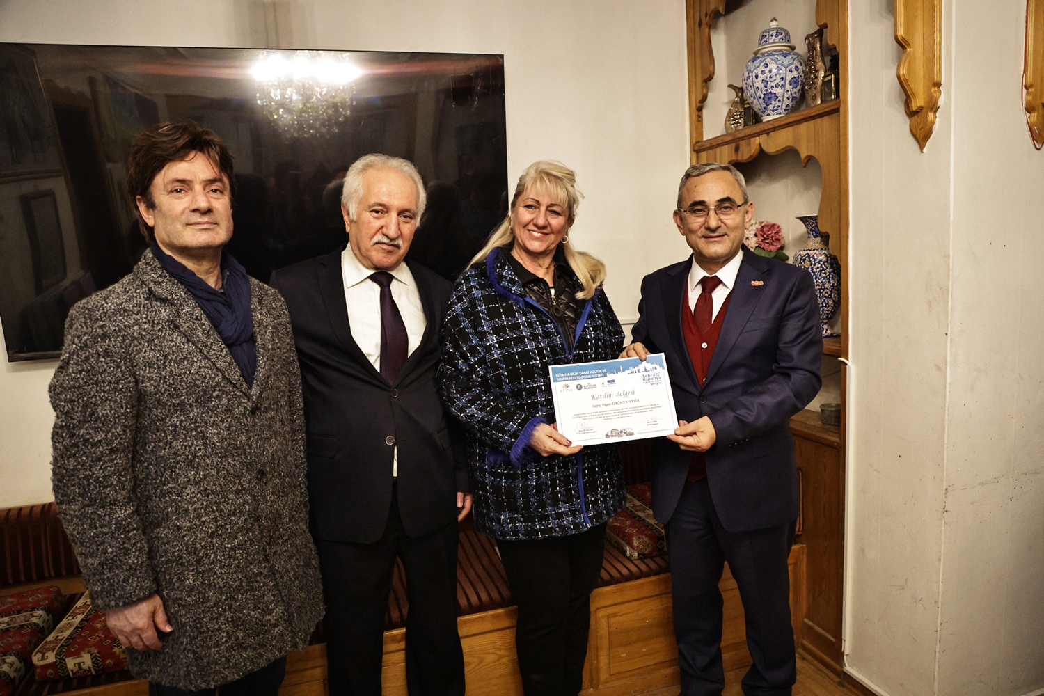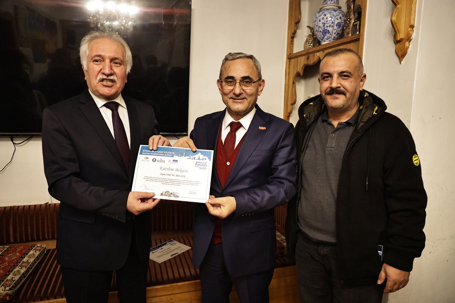 Yapılan sohbetin ardından Belediye Başkanımız Prof. Dr. Alim Işık, Kütahya Bilim, Sanat, Kültür ve Tanıtım Federasyonu Başkanı Kerim Vural ile birlikte Antalya’da Kütahya Belediyemizin destekleriyle gerçekleştirilen "Şehr-i Kütahya" Kültür ve Sanat Sergisinde emeği geçenlere teşekkür belgelerini takdim etti.