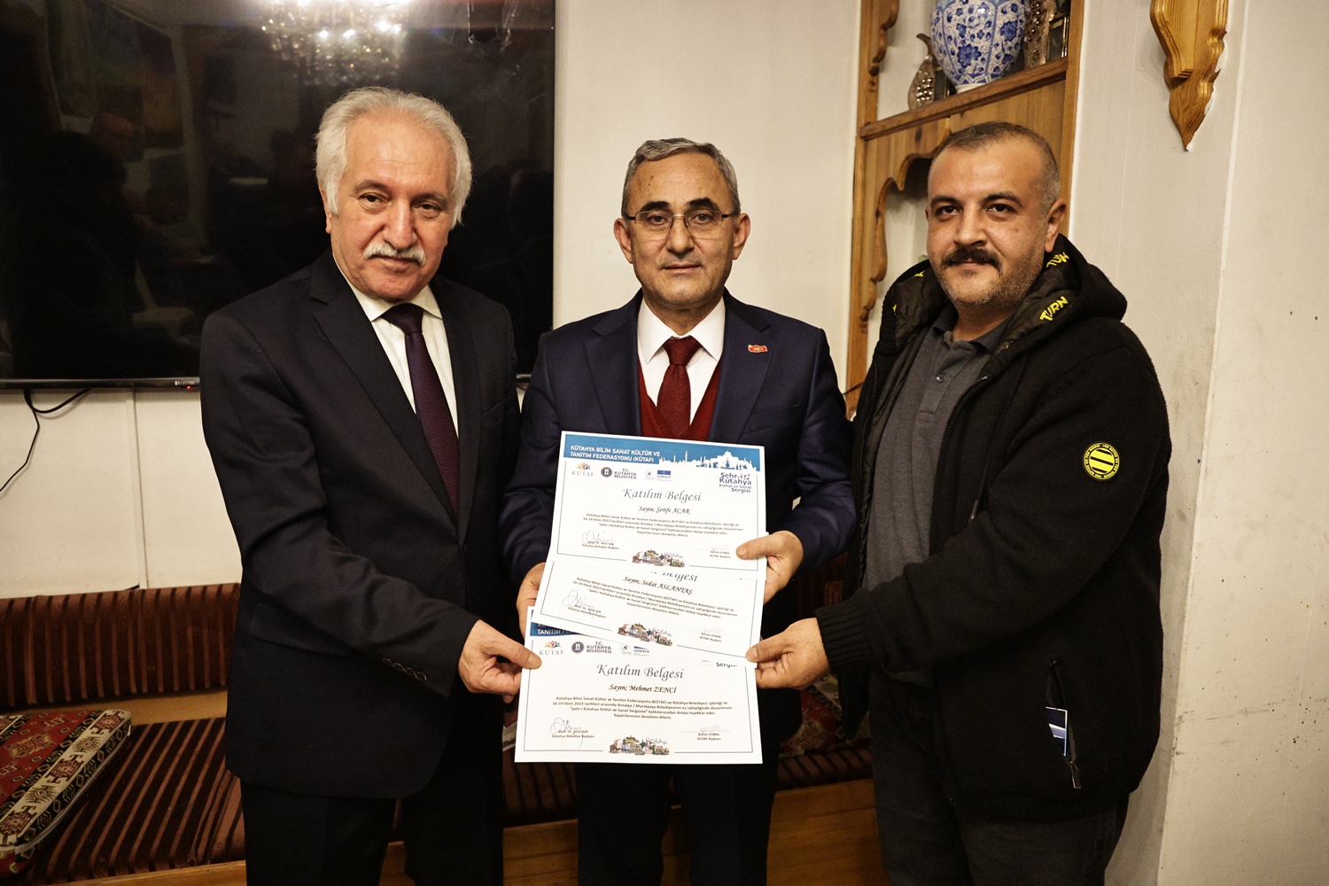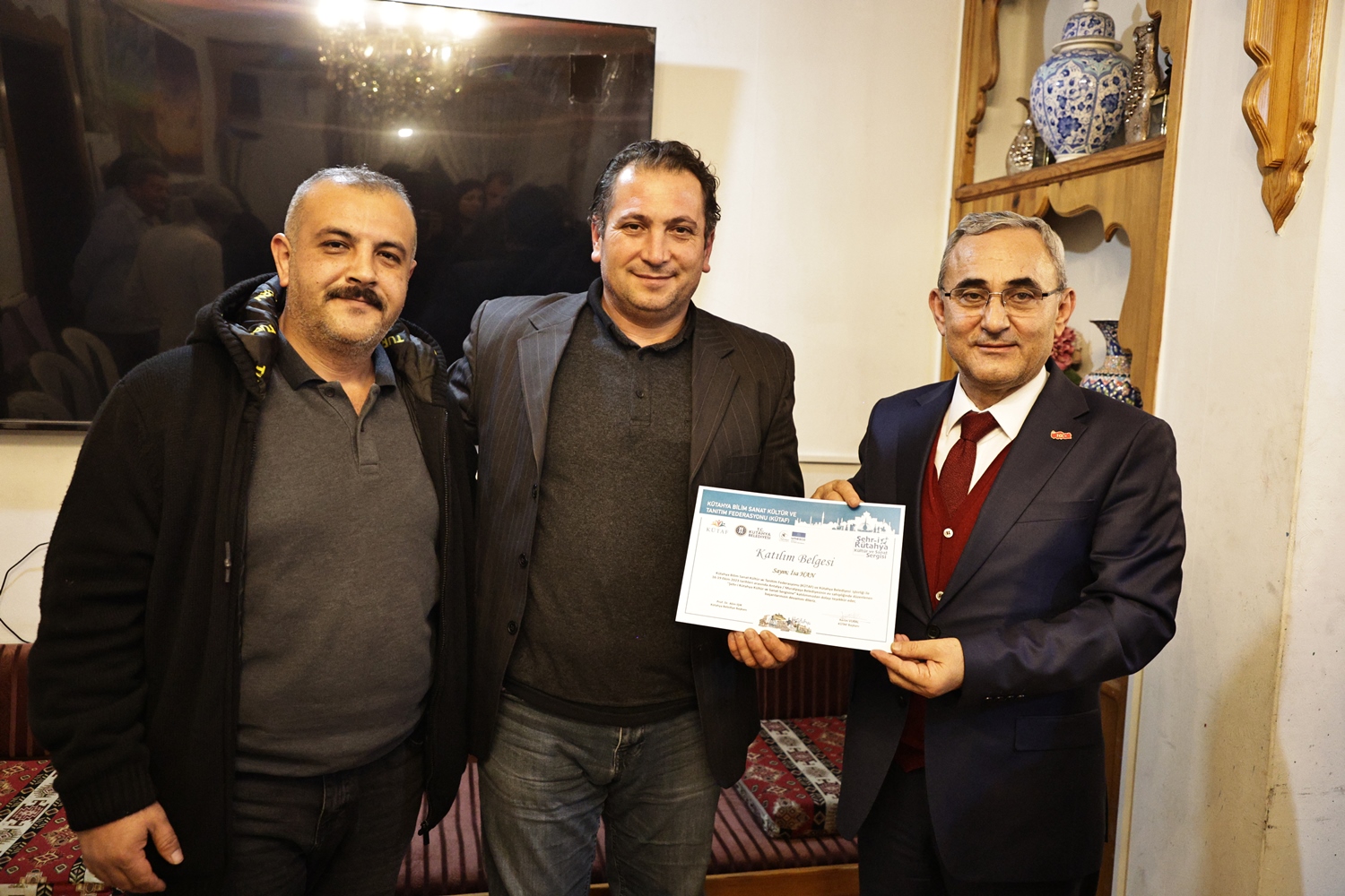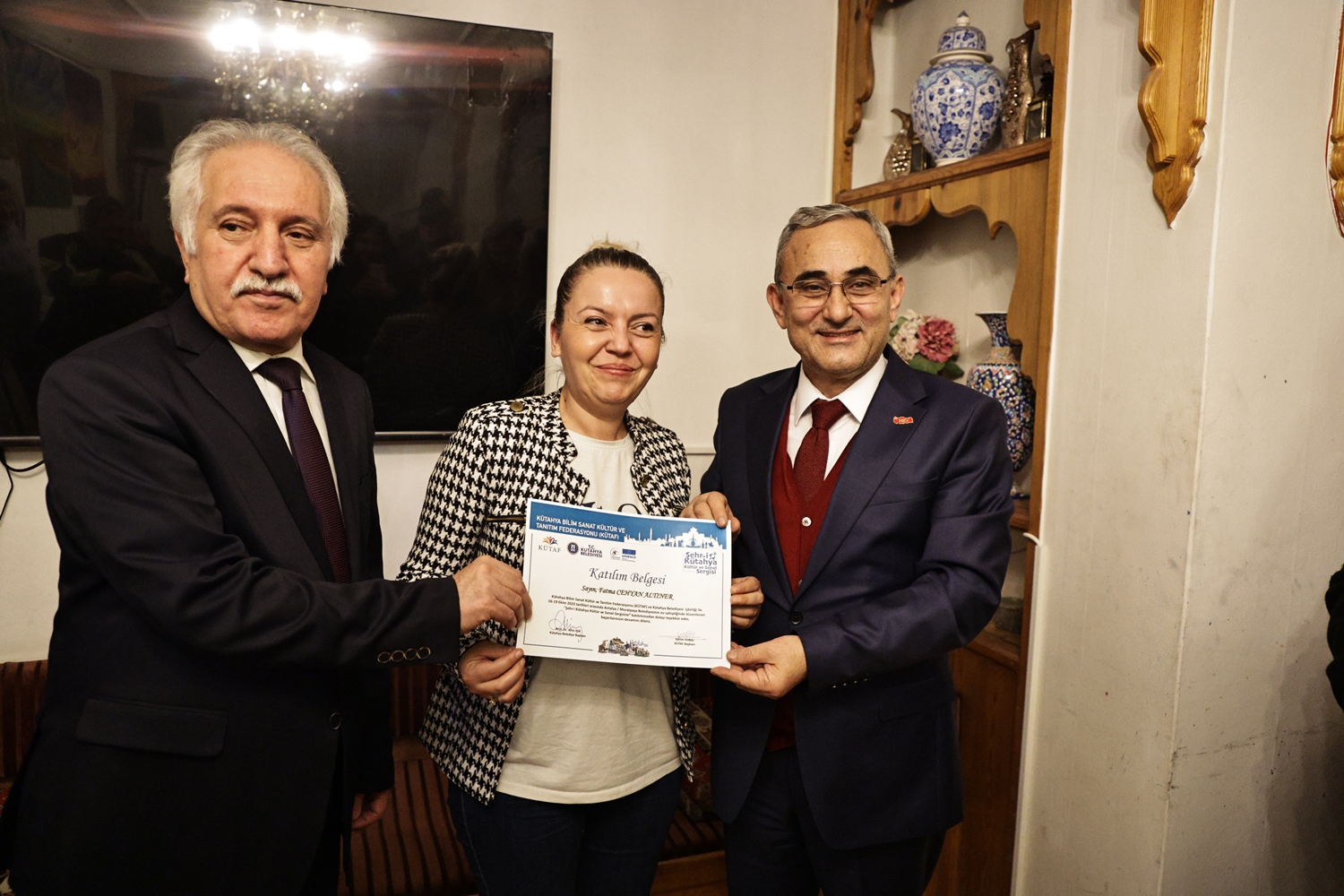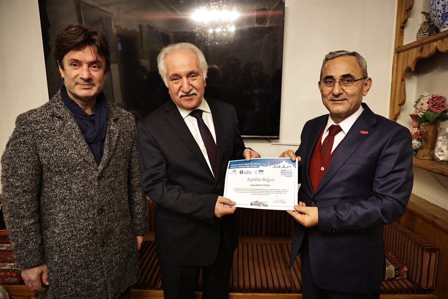 Yapılan sohbetin ardından Belediye Başkanımız Prof. Dr. Alim Işık, Kütahya Bilim, Sanat, Kültür ve Tanıtım Federasyonu Başkanı Kerim Vural ile birlikte Antalya’da Kütahya Belediyemizin destekleriyle gerçekleştirilen "Şehr-i Kütahya" Kültür ve Sanat Sergisinde emeği geçenlere teşekkür belgelerini takdim etti.