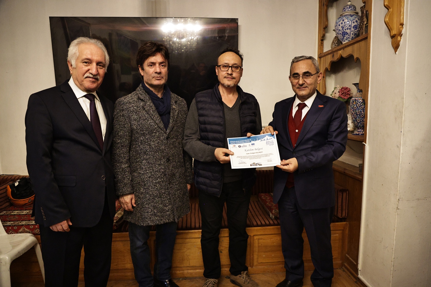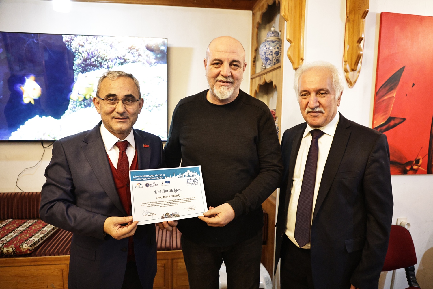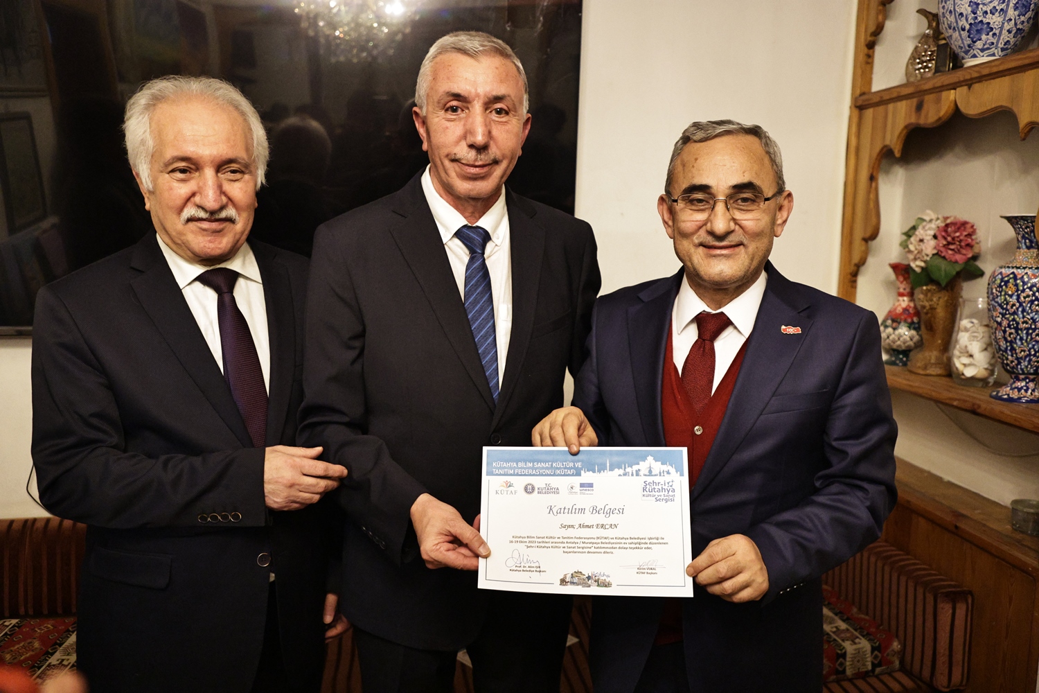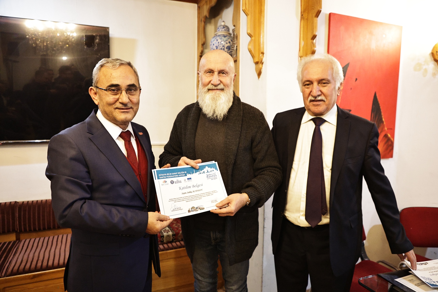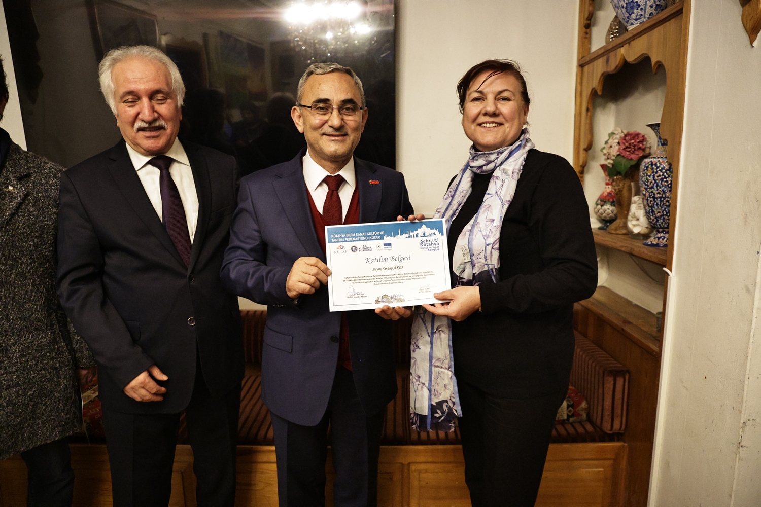Yapılan sohbetin ardından Belediye Başkanımız Prof. Dr. Alim Işık, Kütahya Bilim, Sanat, Kültür ve Tanıtım Federasyonu Başkanı Kerim Vural ile birlikte Antalya’da Kütahya Belediyemizin destekleriyle gerçekleştirilen "Şehr-i Kütahya" Kültür ve Sanat Sergisinde emeği geçenlere teşekkür belgelerini takdim etti.