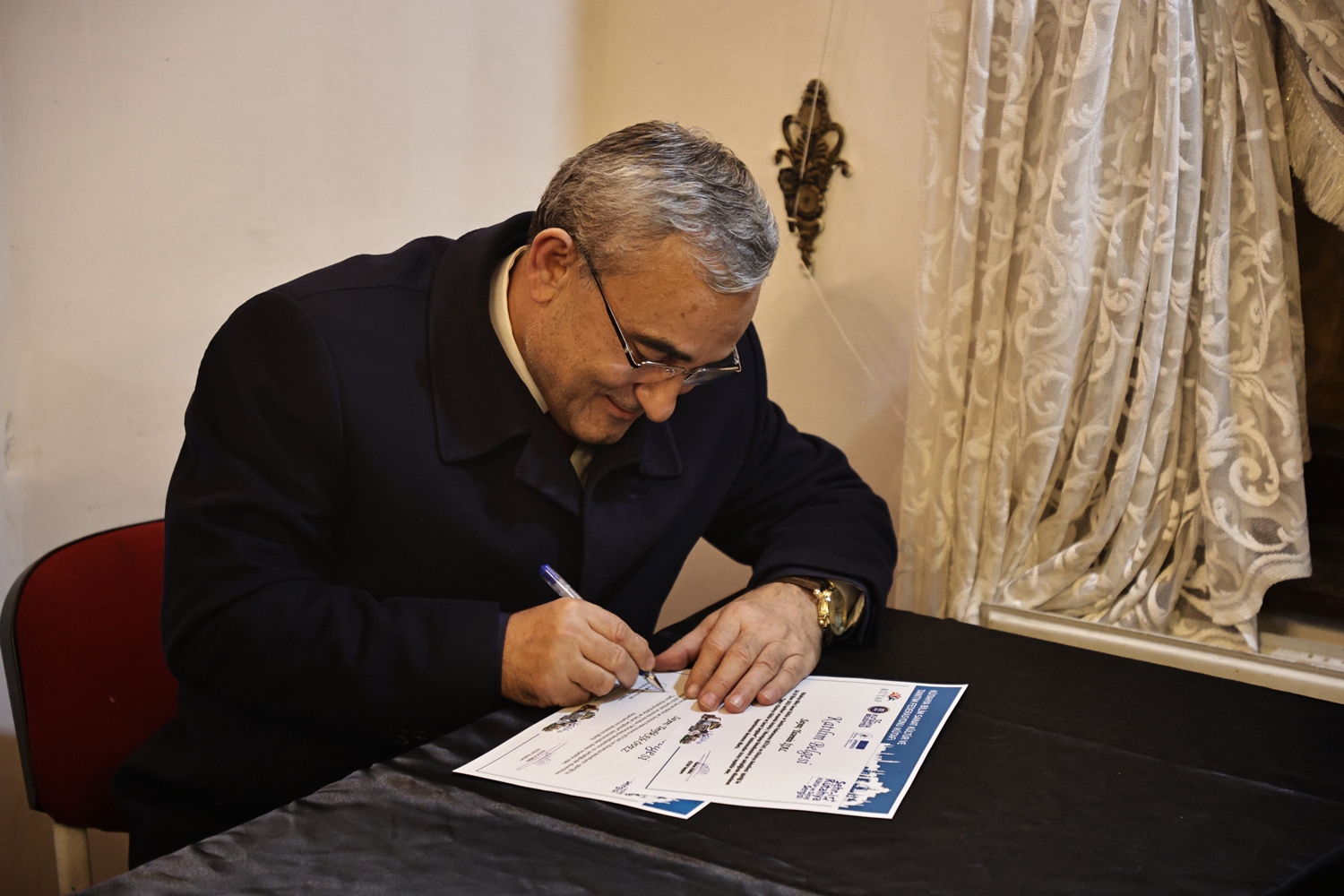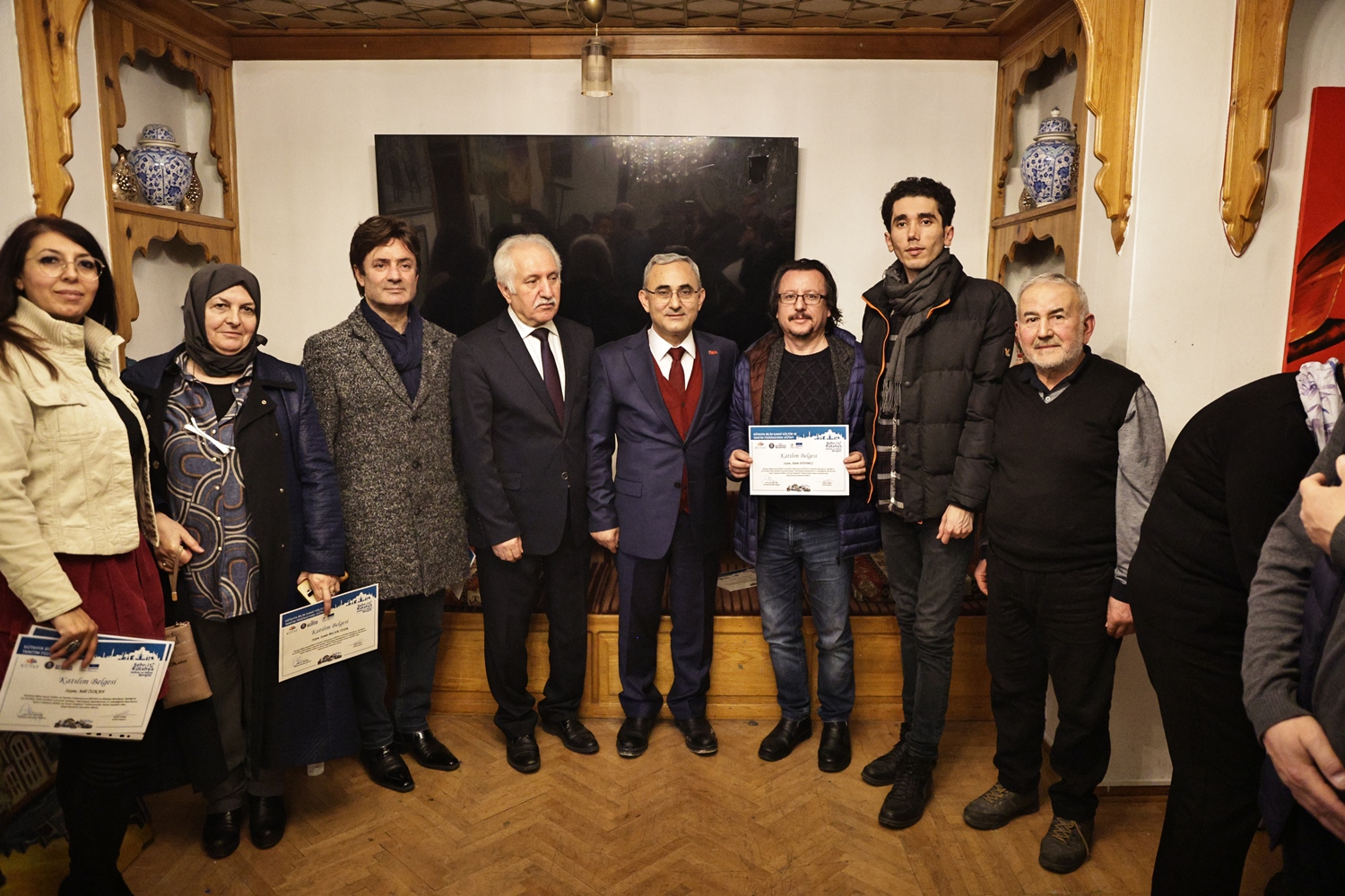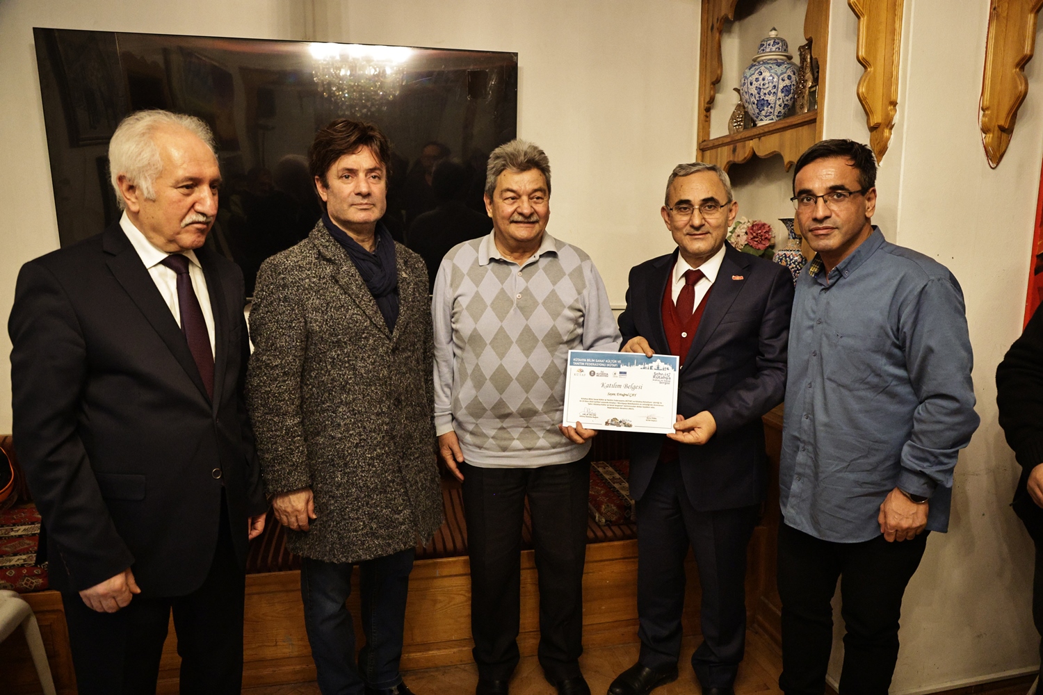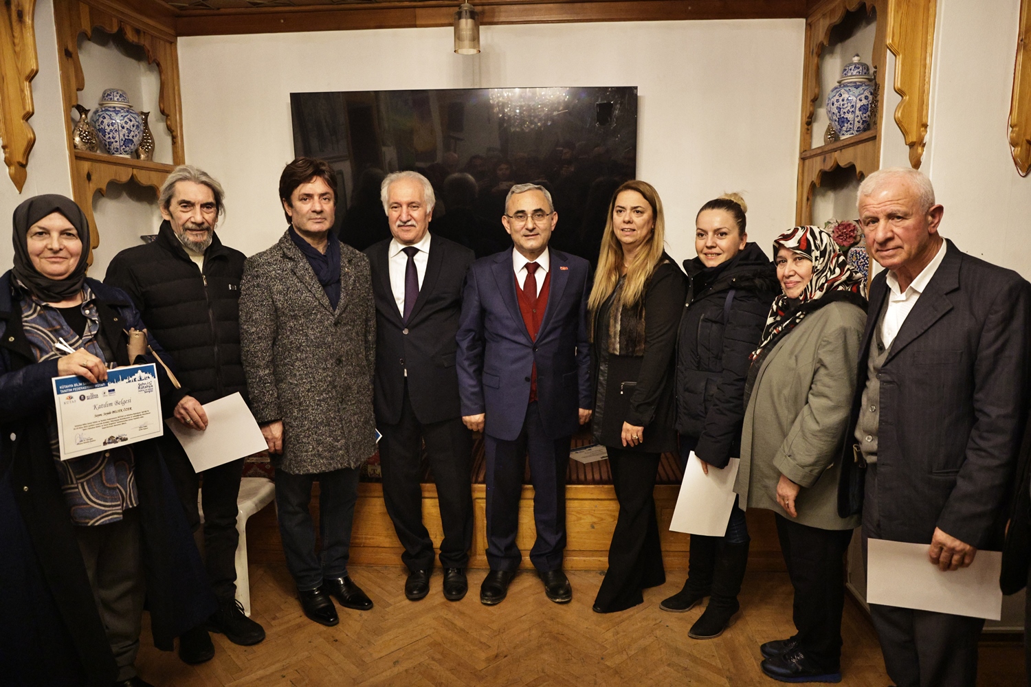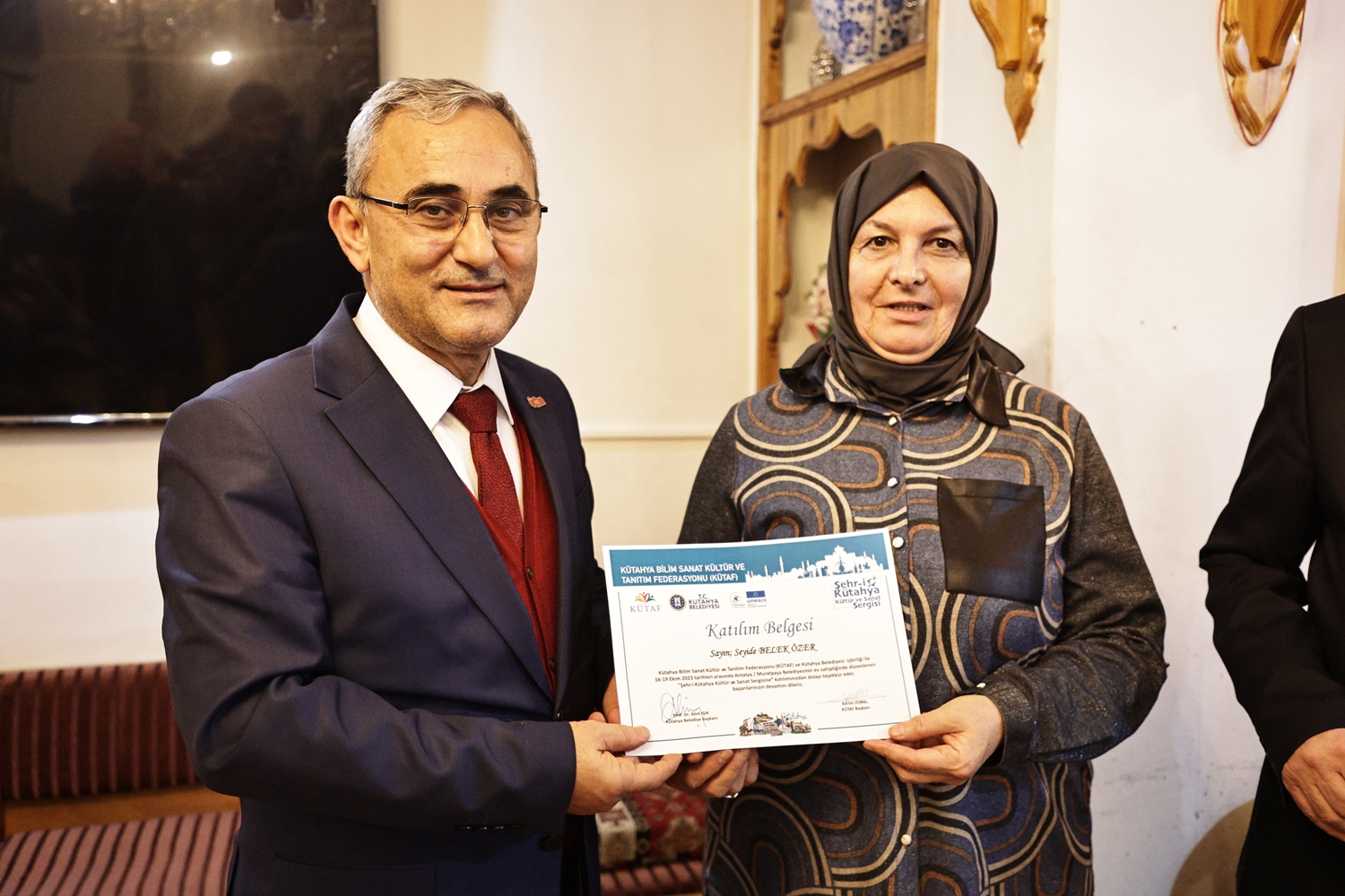 Yapılan sohbetin ardından Belediye Başkanımız Prof. Dr. Alim Işık, Kütahya Bilim, Sanat, Kültür ve Tanıtım Federasyonu Başkanı Kerim Vural ile birlikte Antalya’da Kütahya Belediyemizin destekleriyle gerçekleştirilen "Şehr-i Kütahya" Kültür ve Sanat Sergisinde emeği geçenlere teşekkür belgelerini takdim etti.