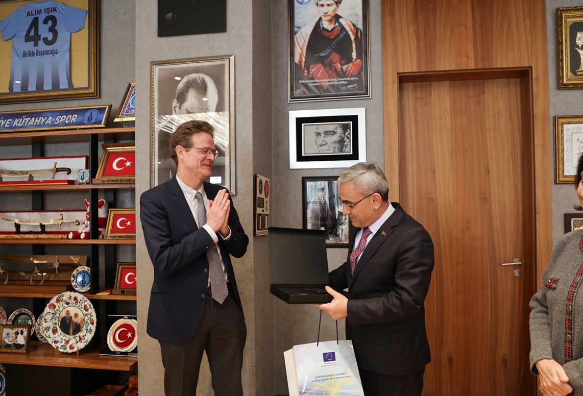 Kütahya Belediye Başkanımız Prof. Dr. Alim Işık, Avrupa Birliği Türkiye Delegasyonu Başkanı Büyükelçi Nikolaus Meyer-Landrut ve beraberindeki heyeti makamında ağırladı. Avrupa Birliği Türkiye Delegasyonu Başkanı Büyükelçi Nikolaus Meyer-Landrut, Kütahya Belediyemizin yararlanıcısı olduğu, Zafer Kalkınma Ajansı, Kütahya Ticaret ve Sanayi Odası, Kütahya Çiniciler Fotoğrafçılar ve El Sanatları Esnaf Odası ve Dumlupınar Üniversitesi’nin ortağı olduğu Avrupa Birliği fonlu IPA II Rekabetçi Sektörler Programı kapsamında yürütülen Kütahya’da Dijitalleşme ve Yaratıcılık Ekosisteminin Geliştirilmesi Projesi hakkında şehrimizde birtakım incelemelerde bulunacak. Belediye Başkanımız Prof. Dr. Alim Işık ile birlikte projenin tanıtım toplantısına katılan Büyükelçi Nikolaus Meyer-Landrut, sıcak ev sahipliğinden dolayı Başkanımız Işık’a teşekkürlerini iletti.