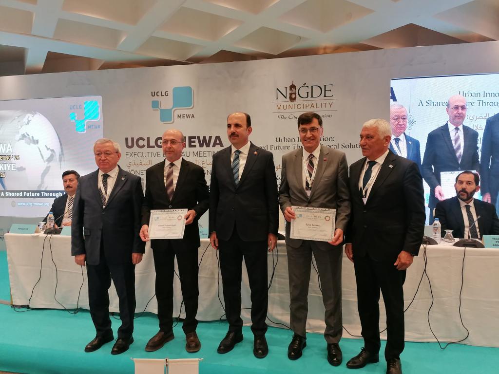 Uluslararası ölçekte faaliyet gösteren ve yerel yönetimlerin iş birliğini güçlendirmeyi amaçlayan UCLG-MEWA tarafından gerçekleştirilen değerlendirmelerde; projeleri, uluslararası platformlardaki aktif temsiliyeti ve yerel yönetim vizyonu takdir edilen Belediye Başkanımız Eyüp Kahveci, başarı belgesi almaya hak kazandı.