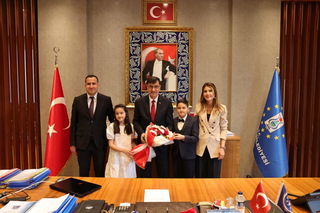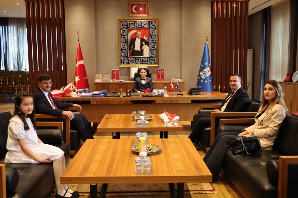 Kütahya Belediye Başkanımız Eyüp Kahveci, 23 Nisan Ulusal Egemenlik ve Çocuk Bayramı kapsamında anlamlı bir geleneği sürdürerek başkanlık makamını Kütahya Turgut Özal İlkokulu Okul Müdürü Samet Yıldırım’ın kıymetli çocukları Elif Naz Yıldırım ve Emin Onur Yıldırım’a devretti.Belediye hizmet binamızda gerçekleştirilen programda, minik misafirlerimiz temsili olarak başkanlık koltuğuna oturarak bayram sevincini yaşadı. Ulu Önderimiz Gazi Mustafa Kemal Atatürk’ün çocuklara armağan ettiği bu anlamlı günün ruhu, belediyemizde düzenlenen programla bir kez daha hissedildi.