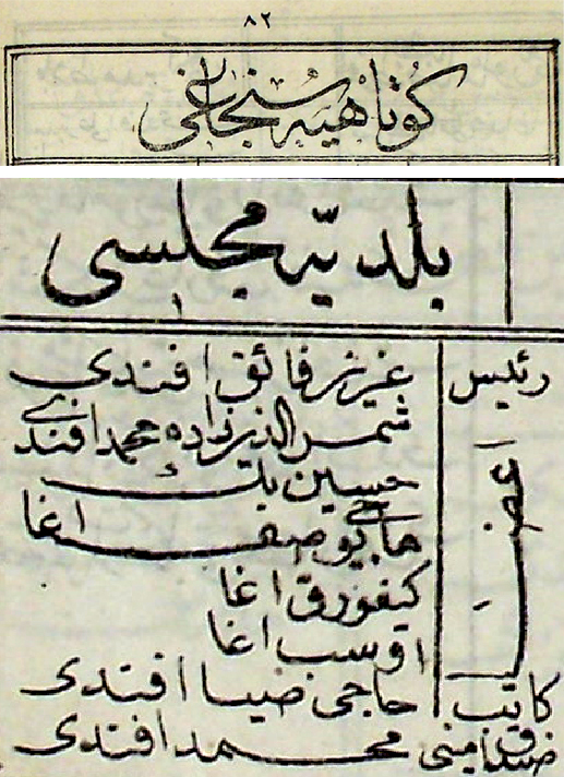 Bu üyeler, aynı zamanda Kütahya Belediye’sinin resmi olarak, kuruluşunun ilk Meclis Üyelerini teşkil etmektedir.